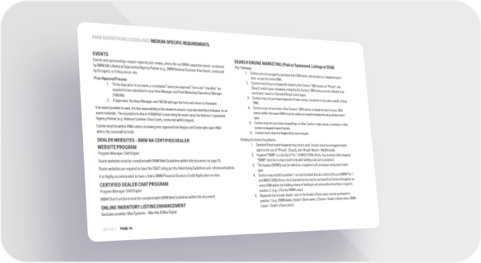 BMW ADVERTISING GUIDELINES MEDIUM-SPECIFIC REQUIREMENTS EVENTS SEARCH ENGINE MARKETING (Paid or Sponsored Listings orSEM) Events and sponsorships require regional prior review, unless the are BMW-supported events conducted Key-Takeaways: by BMW NA9s National Experiential Agency Partner (e.g., BMW National Summer Drive Event, conducted 1. Centers are encouraged to purchase their DBA name and location as a keyword search by Octagon), or if they areon-site. term across the entireDMA. Prior ApprovalProcess 2. Centers must focus on keywords related to the Centers9 DBA names as