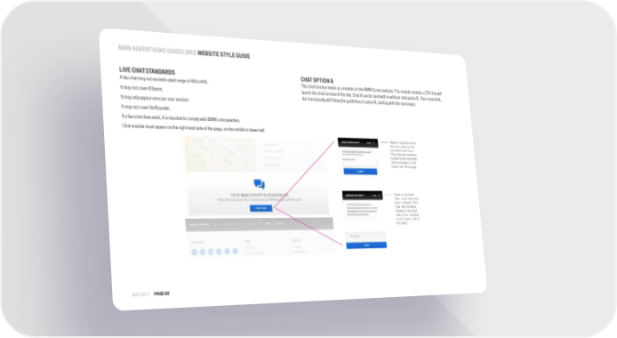 BMW ADVERTISINGGUIDELINES WEBSITE STYLE GUIDE LIVE CHATSTANDARDS CHAT OPTION A A live chat may not exceed a pixel range of 400 x400. This chat function exists as a module on the BMW Center website. The module contains a CTA that will It may not cover IDboxes. launch the chat function of the site. Chat A can be used with or without chat option B. Once launched, the functionality will follow the guidelines in option B, starting with the nameinput. Itmayonlyappearonceperusersession. It may not cover theRoundel. If a live chat does exist, it is required to comply with BMW colorpalettes. Chatmodulemustappearonthe righthandsideofthe page,onthe middletolowerhalf. State of chat box once the user clicks on the persistent chat icon. This chat box remains locked to the rightside of the browser on the lower half ofthe page. State of chat box after user name has been entered. This chat box remains locked to the right side of the browser on the lower half of the page. JULY 2017 PAGE85