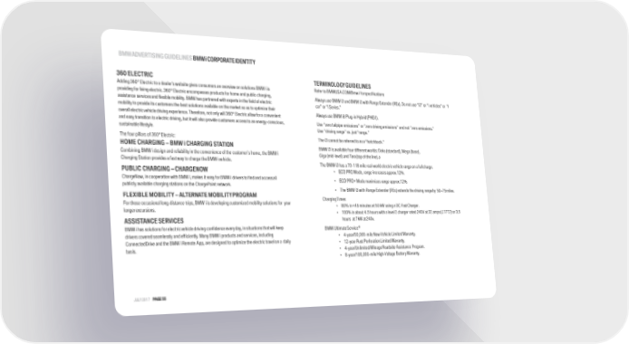 BMWADVERTISINGGUIDELINESBMWiCORPORATEIDENTITY 360 ELECTRIC TERMINOLOGYGUIDELINES Adding 360º Electric to a dealer9s website gives consumers an overview on solutions BMW iis Refer to BMWUSA.COM/Bmw i forspecifications providing for living electric. 360º Electric encompasses products for home and public charging, Always use BMW i3 and BMW i3 with Range Extender (REx). Do not use