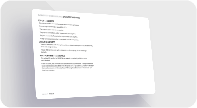BMW ADVERTISINGGUIDELINES WEBSITE STYLE GUIDE POP-UPSTANDARDS Pop-ups are classified as content that appears without a user9s call toaction. Pop-ups may not exceed a pixel range of 800 x800. Theymayonlyappearonceperusersession. They may not cover ID boxes, unless they are a lead-generatingform. They may not cover the Roundel, unless they are a lead-generatingform. All pop-up messages are required to comply with the BMW colorpalettes. DESIGNSTANDARDS Theuseofanimations orvirtualtourguides,which candistractfromthe premium nature ofthe brand, do not meet designstandards. The use of design elements, such as starbursts and glittery signage, do not meetdesign standards. MULTIPLE WEBSITESTANDARDS The website URL listed on the BMWUSA.com dealer locator is the single URL that may be used/advertised. If otherURLsexist,theyarerequiredtoberedirectedtothecompliantwebsite. The only exception is a service or accessories URL as stated in the Aftersales SEM Co-op Guidelines. CenterNet > Aftersales > Business Development and Marketing Portal > Marketing Tools & Information > Aftersales Co-op > SEM Co-opGuidelines JULY 2017 PAGE89