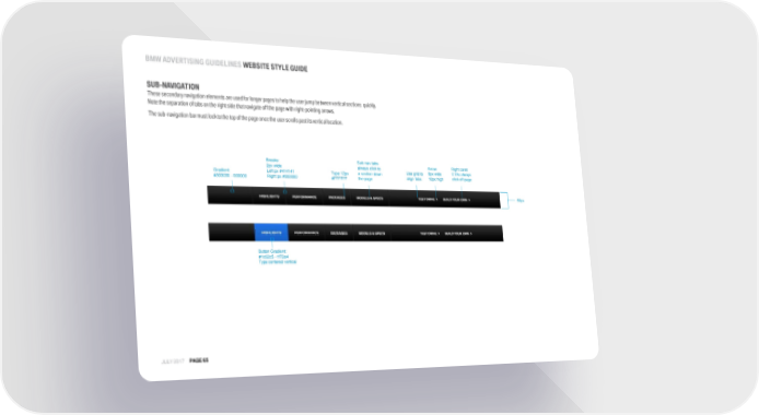 BMW ADVERTISINGGUIDELINES WEBSITE STYLE GUIDE SUB-NAVIGATION Thesesecondarynavigationelementsare usedforlongerpagestohelptheuserjumpbetweenverticalsections quickly. Notetheseparationoftabs ontherightsidethatnavigate offthepagewithright-pointing arrows. Thesub-navigationbarmustlocktothetopofthepageoncetheuserscrollspastitsverticallocation. Breaks: Sub nav tabs Arrow Right caret 2px wide always click to Use grid to 6px wide CTAs always Gradient: Left px #414141 Type 12px a section down align tabs 10px high click off page #303030 - 000000 Right px #000000 #FFFFFF the page 60px ButtonGradient: #1c62c5 -1f72e4 Type centered vertical JULY 2017 PAGE65