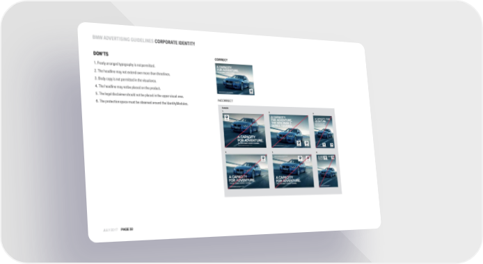 BMW ADVERTISINGGUIDELINES CORPORATE IDENTITY CORRECT DON’TS 1. Freely arranged typography is notpermitted. 2.The headline may not extend over more than threelines. 3. Body copy is not permitted in the visualarea. 4. The headline may notbe placed on the product. 5. Thelegaldisclaimershould notbeplacedinthe uppervisualarea. INCORRECT 6. The protection space must be observed around the IdentityModules. JULY 2017 PAGE32