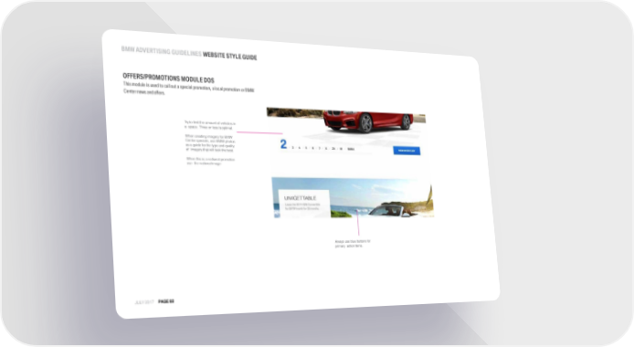 BMW ADVERTISINGGUIDELINES WEBSITE STYLE GUIDE OFFERS/PROMOTIONS MODULEDOS This module is used to call out a special promotion, a local promotion or BMW Center news andoffers. Try to limit the amount of vehicles in a space. Three or less isoptimal. When creating imagery for BMW Center specials, use BMW photos asaguideforthetypeandquality of imagerythat will look the best. When this is a national promotion use the nationalimage. Always use blue buttons for primary actionitems. JULY 2017 PAGE82