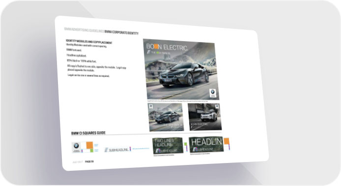 BMWADVERTISINGGUIDELINESBMWiCORPORATEIDENTITY IDENTITY MODULES AND COPYPLACEMENT Identity Modules used with correct spacing. BMW fontused. Headlinecapitalized. 85% black or 100% whitefont. All copy is flushed to one side, opposite the module. Legal copy placed opposite themodule. Legal can be one or several lines asrequired. BMW CI SQUARESGUIDE JULY 2017 PAGE50