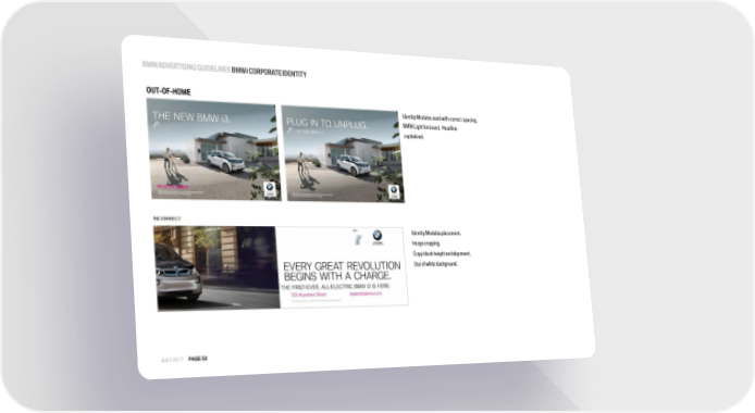 BMWADVERTISINGGUIDELINESBMWiCORPORATEIDENTITY OUT-OF-HOME Identity Modules used with correct spacing. BMW Light fontused. Headline capitalized. Identity Modulesplacement. Imagecropping. Copy block height andalignment. Use of whitebackground. JULY 2017 PAGE52