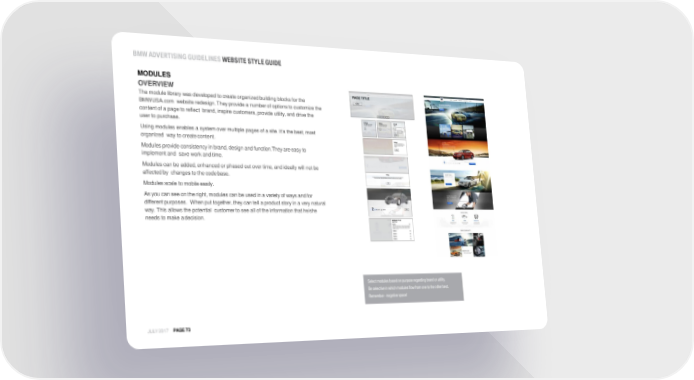 BMW ADVERTISINGGUIDELINES WEBSITE STYLE GUIDE MODULES OVERVIEW The module library was developed to create organized building blocks for the BMWUSA.com website redesign.Theyprovide a numberofoptionsto customizethe contentofa pageto reflect brand, inspire customers, provide utility, and drive the user to purchase. Using modules enables a system over multiple pages of a site. It’s the best, most organized way to createcontent. Modules provide consistency in brand, design and function.They are easy to implement and save work andtime. Modules can be added, enhanced or phased out over time, and ideally will not be affected by changes to the codebase. Modules scale to mobileeasily. Asyou canseeonthe right,modules canbe usedin avarietyofways andfor different purposes. When put together, they can tell a product story in a very natural way. This allows the potential customer to see all of the information that he/she needs to make adecision. JULY 2017 PAGE73