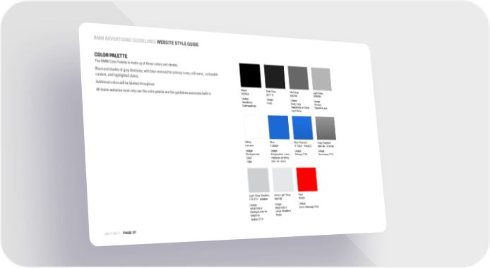BMW ADVERTISINGGUIDELINES WEBSITE STYLE GUIDE COLOR PALETTE The BMW Color Palette is made up of these colors and shades. Black and shades of gray dominate, with blue reserved for primary icons, roll-overs, actionable content, and highlighted states. Additional colors will be labeled throughout. Black Dark Gray Mid Gray Light Gray All dealer websites must only use this color palette and the guidelines associated with it. 000000 221F1F 666766 B5B5B5 Usage: Usage: Usage: Usage: Headlines Copy Body copy Strokes Subheadlines Headlines on Extra Hyperlink text Light Gray White Blue Blue Gradient Gray Gradient FFFFFF 1C69D4 1F72E4 - 1A62C5 666766 - 979799 Usage: Usage: Usage: Usage: Backgrounds Infographics, icons, Primary CTA Secondary CTA Copy marquee scrolling Tabs dots (on state) Light Gray Gradient Extra Light Gray Red FFFFFF - ededee e6e7e8 ff0000 Usage: Usage: Usage: WEB ONLY WEB ONLY Error Message Only Backgrounds for Large Headline data/info Areas Mobile CTA JULY 2017 PAGE 57