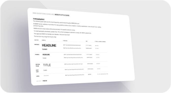 BMW ADVERTISINGGUIDELINES WEBSITE STYLE GUIDE TYPOGRAPHY ThefollowingtypestylesarethemostfrequentlyusedformatsthroughoutBMWUSA.com. All BMW Center websites must follow the copy guidelines below to be compliant, including capitalization rules and point size, leading and kerningrules. Additional and unique styles will be documented in the specific element comps. Tomeettypographystandards,greaterthan75%ofthehomepageisrequiredtocomplywith BMW’sglobalfonts. The approved BMW font families are Helvetica, Arial and SansSerif Thefontsize mayrangefrom8ptto44pt SECTION SAMPLE TYPEFACE HEX PT SIZE / LEADING /KERNING MARQUEE HEADLINE BMW Type Global Bold/Helvetica/Arial/SansSerif FFFFFF/000000 44 / 44 /0 Content BMW Type Global Bold/Helvetica/Arial/SansSerif FFFFFF/000000 20 / 25 /0 PROMOS HEADLINE BMW Type Global Bold//Helvetica/Arial/SansSerif FFFFFF/000000 18 / 22 /0 Content BMW Type Global Regular/Helvetica/Arial/SansSerif FFFFFF/000000 14 / 20 /0 SECTION TITLE BMW Type Global Light/Arial Light/Sans SerifLight FFFFFF/000000 36 / 40 /0 TITLES BODY Content BMW Type Global Regular/Helvetica/Arial/SansSerif FFFFFF/000000 14 / 20 /0 COPY LEGAL LEGAL CONTENT BMW Type Global Regular/Helvetica/Arial/SansSerif 666766 10 / 16 / 0 (minimum size = 8pt.) JULY 2017 PAGE58