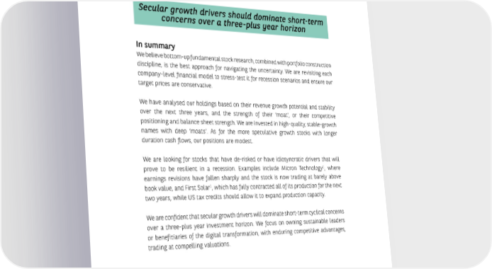 INVESTMENT OUTLOOK FOR 2023 - 24 - 3. COVID beneficiaries such as the e-commerce sector might continue to underperform as growth reverts to pre-pandemic trend lines. 4. The Ukraine war, the Sino-US trade war, and authoritarian and nationalist movements, including supply chain nationalism, are creating uncertainty. 5. Regulation remains a risk. Secular growth drivers should dominate short-term concerns over a three-plus year horizon In summary We believe bottom-up fundamental stock research, combined with portfolio construction discipline, is the best approach for navigating the uncertainty. We are revisiting each company-level financial model to stress-test it for recession scenarios and ensure our target prices are conservative. We have analysed our holdings based on their revenue growth potential and stability over the next three years, and the strength of their ‘moat’, or their competitive positioning and balance sheet strength. We are invested in high-quality, stable-growth names with deep ‘moats’. As for the more speculative growth stocks with longer duration cash flows, our positions are modest. We are looking for stocks that have de-risked or have idiosyncratic drivers that will 1 prove to be resilient in a recession. Examples include Micron Technology , where earnings revisions have fallen sharply and the stock is now trading at barely above 1 book value, and First Solar , which has fully contracted all of its production for the next two years, while US tax credits should allow it to expand production capacity. We are confident that secular growth drivers will dominate short-term cyclical concerns over a three-plus year investment horizon. We focus on owning sustainable leaders or beneficiaries of the digital transformation, with enduring competitive advantages, trading at compelling valuations. 1. These stocks are mentioned for illustrative purposes only. BNP Paribas Asset Management strategies may or may not hold positions in these stocks. The value of investments and the income they generate may go down as well as up and it is possible that investors will not recover their initial outlay. Past performance is no guarantee for future returns.