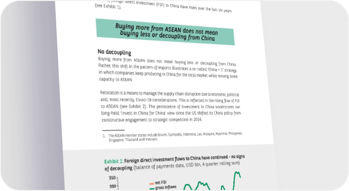 INVESTMENT OUTLOOK FOR 2023 - 26 - China picked up, even though Chinese purchases fell short of the so-called Phase One deal signed in January 2020. Secondly, rather than reducing their reliance on Asian supply chains, US importers 1 have increased imports from the wider ASEAN region. Flows of foreign direct investment (FDI) to China have risen over the last six years (see Exhibit 1). Buying more from ASEAN does not mean buying less or decoupling from China No decoupling Buying more from ASEAN does not mean buying less or decoupling from China. Rather, this shift in the pattern of imports illustrates a so-called ‘China + 1’ strategy, in which companies keep producing in China for the local market while moving some capacity to ASEAN. Relocation is a means to manage the supply chain disruption due to economic, political and, most recently, Covid-19 considerations. This is reflected in the rising flow of FDI to ASEAN (see Exhibit 2). The persistence of investment in China underscores our long-held ‘Invest in China for China’ view since the US shifted its China policy from constructive engagement to strategic competition in 2016. 1. The ASEAN member states include Brunei, Cambodia, Indonesia, Lao, Malaysia, Myanmar, Philippines, Singapore, Thailand and Vietnam. Exhibit 1: Foreign direct investment flows to China have continued - no signs of decoupling (balance of payments data, USD bln, 4 quarter rolling sum) 350 300 net FDI 250 gross inflows 200 150 100 50 0 -50 -100 1999 2001 2004 2006 2009 2012 2014 2017 2019 2022 Sources: CEIC, BNP Paribas Asset Management, data as of October.2022
