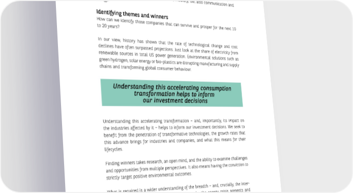 INVESTMENT OUTLOOK FOR 2023 - 21 - of producing and delivering more and more goods and services to near zero (or a marginal amount). Over the next decade, Industry 4.0 infrastructure looks set to expand to include, for example, self-driving cars using cheap renewable energy on smart transport ‘internets’. This should allow people to share mobility, but also communication and energy. Identifying themes and winners How can we identify those companies that can survive and prosper for the next 10 to 20 years? In our view, history has shown that the rate of technological change and cost declines have often surpassed projections. Just look at the share of electricity from renewable sources in total US power generation. Environmental solutions such as green hydrogen, solar energy or bio-plastics are disrupting manufacturing and supply chains and transforming global consumer behaviour. Understanding this accelerating consumption transformation helps to inform our investment decisions Understanding this accelerating transformation – and, importantly, its impact on the industries affected by it – helps to inform our investment decisions. We seek to benefit from the penetration of transformative technologies, the growth rates that this advance brings for industries and companies, and what this means for their lifecycles. Finding winners takes research, an open mind, and the ability to examine challenges and opportunities from multiple perspectives. It also means having the conviction to strictly target positive environmental outcomes. What is required is a wider understanding of the breadth – and, crucially, the inter- relatedness – of the challenges that, for example, the energy crisis presents and the opportunities it creates, such as an accelerated transition to renewable, locally produced sources of energy. A thorough understanding of previous and current periods of disruption can help us identify the potential investment winners of the coming new carbon-free age. And we are convinced that active investment management is the key to identifying companies that can outperform.