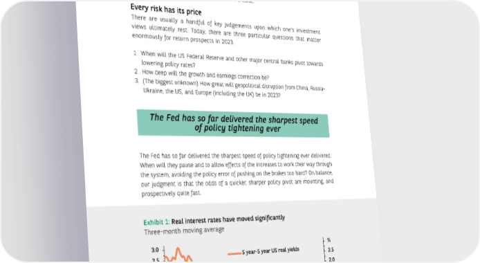 INVESTMENT OUTLOOK FOR 2023 - 11 - not accurately reflect what we believe are favourable fundamentals. We are not yet ready to add more broadly to riskier assets such as equities. We are still concerned over greater downside to both growth and earnings, and continued geopolitical uncertainty could weigh further on cash flow projections. At the same time, we acknowledge that areas including long-duration US tech companies are starting to look interesting as 2022 draws to a close. Every risk has its price There are usually a handful of key judgements upon which one’s investment views ultimately rest. Today, there are three particular questions that matter enormously for return prospects in 2023. 1. When will the US Federal Reserve and other major central banks pivot towards lowering policy rates? 2. How deep will the growth and earnings correction be? 3. (The biggest unknown) How great will geopolitical disruption from China, Russia- Ukraine, the US, and Europe (including the UK) be in 2023? The Fed has so far delivered the sharpest speed of policy tightening ever The Fed has so far delivered the sharpest speed of policy tightening ever delivered. When will they pause and to allow effects of the increases to work their way through the system, avoiding the policy error of pushing on the brakes too hard? On balance, our judgment is that the odds of a quicker, sharper policy pivot are mounting, and prospectively quite fast. Exhibit 1: Real interest rates have moved significantly Three-month moving average 3.0 % 2.5 5 year-5 year US real yields 2.5 2.0 2.0 1.5 1.5 1.0 1.0 0.5 0.5 0.0 0.0 -0.5 -0.5 -1.0 -1.0 -1.5 -1.5 2005 2010 2015 2020 Data as at 25 Oct. 2022. Sources: Bloomberg, BNP Paribas Asset Management.
