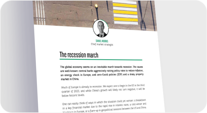 INVESTMENT OUTLOOK FOR 2023 - 6 - MACRO OUTLOOK DANIEL MORRIS Chief market strategist The recession march The global economy seems on an inevitable march towards recession. The causes are well-known: central banks aggressively raising policy rates to reduce inflation, an energy shock in Europe, and zero-Covid policies (ZCP) and a shaky property market in China. Much of Europe is already in recession. We expect one to begin in the US in the third quarter of 2023, and while China’s growth will likely not turn negative, it will be below historic levels. One can easily think of ways in which the situation could yet worsen: a breakdown in a key financial market due to the rapid rise in interest rates, a cold winter and blackouts in Europe, or a flare-up in geopolitical tensions between the US and China. US Given the strength of the US labour market, reflected not only in a low unemployment rate, but also in high (nominal) wage gains, declines in non-farm payrolls in 2023 will likely be necessary. Consumer demand will weaken, even though households still have a large amount of ‘excess’ savings. These savings are falling and, we should note, are concentrated among high-income/low-consumption households. A deterioration of the labour market will be key to bringing services inflation under control. Goods inflation should drop thanks to base effects and lower demand, while