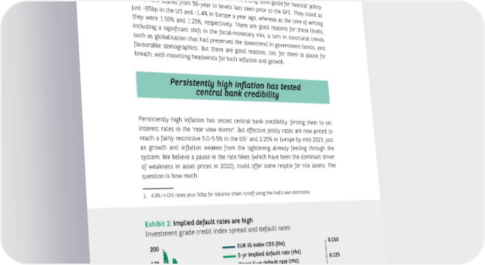 INVESTMENT OUTLOOK FOR 2023 - 12 - Interest rates, both real and nominal, both current and implied, increased dramatically in major economies in 2022. While the increase occurred across the curve, it was particularly sharp at the short end. The 500bp rise in 2-year real rates since March was has been remarkable, as was the move in the expected level of fed funds in three years from 1.5% to 5% in just six months. Five-year real rates (measured five years ahead), that many view as a long-term guide for ‘neutral’ policy rates, have soared from 50-year to levels last seen prior to the GFC. They stood at just -85bp in the US and -1.4% in Europe a year ago, whereas at the time of writing they were 1.50% and 1.25%, respectively. There are good reasons for those levels, including a significant shift in the fiscal-monetary mix, a turn in structural trends such as globalisation that had preserved the downtrend in government bonds, and favourable demographics. But there are good reasons, too, for them to pause for breath, with mounting headwinds for both inflation and growth. Persistently high inflation has tested central bank credibility Persistently high inflation has tested central bank credibility, forcing them to set interest rates in the ‘rear view mirror’. But effective policy rates are now priced to 1 reach a fairly restrictive 5.0-5.5% in the US and 2.25% in Europe by mid-2023, just as growth and inflation weaken from the tightening already feeding through the system. We believe a pause in the rate hikes (which have been the dominant driver of weakness in asset prices in 2022), could offer some respite for risk assets. The question is how much. 1. 4.9% in OIS rates plus 50bp for balance sheet runoff using the Fed’s own estimates Exhibit 2: Implied default rates are high Investment grade credit index spread and default rates 200 EUR IG index CDS (lhs) 0.150 175 5-yr imlied del re (rhs) rs 5-yr del re (rhs) 0.125 150 €er‚e 5-yr del re (rhs) 0.100 125 0.075 100 75 0.050 50 0.025 25 0.000 2011 2013 2015 2017 2019 2021 Data as at 24 Oct. 2022. Sources: MacroBond, BNP Paribas Asset Management