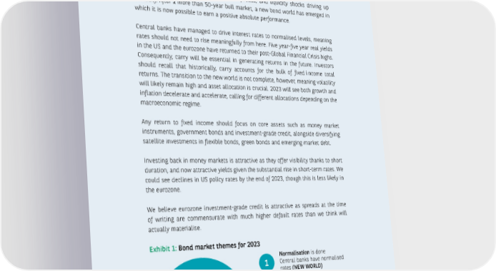INVESINVESTMENT OUTLTMENT OUTLOOK FOR 2023OOK FOR 2023 -- 15 -15 - Focus on fixed income - A new bond world Fixed income bonds saw unprecedentedly poor returns in 2022, with all key sectors posting a negative performance (as at 10 November 2022) due to a normalisation of policy rates, recession hurting credit spreads, and liquidity shocks driving up volatility. After a more than 50-year bull market, a new bond world has emerged in which it is now possible to earn a positive absolute performance. Central banks have managed to drive interest rates to normalised levels, meaning rates should not need to rise meaningfully from here. Five year-five year real yields in the US and the eurozone have returned to their post-Global Financial Crisis highs. Consequently, carry will be essential in generating returns in the future. Investors should recall that historically, carry accounts for the bulk of fixed income total returns. The transition to the new world is not complete, however, meaning volatility will likely remain high and asset allocation is crucial. 2023 will see both growth and inflation decelerate and accelerate, calling for different allocations depending on the macroeconomic regime. Any return to fixed income should focus on core assets such as money market instruments, government bonds and investment-grade credit, alongside diversifying satellite investments in flexible bonds, green bonds and emerging market debt. Investing back in money markets is attractive as they offer visibility thanks to short duration, and now attractive yields given the substantial rise in short-term rates. We could see declines in US policy rates by the end of 2023, though this is less likely in the eurozone. We believe eurozone investment-grade credit is attractive as spreads at the time of writing are commensurate with much higher default rates than we think will actually materialise. Exhibit 1: Bond market themes for 2023 Normalisation is done Central banks have normalised rates (NEW WORLD) 1 Volatility is possible Allocation is crucial (PERFORMANCE) Carry is essential Investors must capture yields (RETURN) Source: BNP Paribas Asset Management as of November 2022