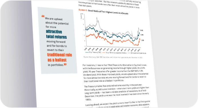 7 2023 OUTLOOK Fixed Income More Attractive Bonds suffered their worst performance in 40 years in 2022, with the Bloomberg Aggregate Bond Index down about 11% after partially recovering 1 from even steeper declines. But the inherent upside of a decline in fixed income prices is that bonds now offer their most attractive yields in more than ten years. Exhibit 5: Bond Yields at Their Highest Levels In A Decade Exhibit 5: Bond Yields at Their Highest Levels In A Decade %10 , d l e i Y8 “We are upbeat about the potential 6 for more 5.08 4 attractive 3.58 2 total returns 1.05 moving forward 0 and for bonds to -2 revert to their 10-yr Treasury (TSY) US Investment Grade Bonds traditional role 10-yr TSY minus expected inflation as a ballast Source: Bloomberg. Note: BBG Corp. Index used for investment grade bonds. As of December 14, 2022. 6 As of 12/14/2022. Source: Bloomberg. Note: BBG Corp Index used for IG bonds. in portfolios. For investors, it means that TINA (There is No Alternative to Equities) is over, ” with the focus now on generating income through higher yields. At a 3.5% yield, 10-year Treasuries offer greater income than the S&P 500’s 1.8% dividend yield. With these improved yields, we are upbeat about the potential for more attractive total returns moving forward and for bonds to revert to their traditional role as a ballast in portfolios. The Treasury market has endured extreme volatility in the past year. Historically, a yield curve inversion – when short-term yields are higher than long-term yields – has been a reliable predictor of recessions. As of mid- December, the yield curve was the most inverted it has been since the early 1980s. Looking ahead, we expect the yield curve to invert further in the first quarter of 2023 as markets price in peak rates and weaker economic data appears. The Treasury yield curve should normalize as markets price in an eventual economic recovery in the latter part of the year. We forecast a 10-year Treasury note yield in the 3.5%-4.0% range by the end of 2023. That’s close to where it is today, but investors should be prepared for significant volatility in the interim. 1 As of December 14, 2022.