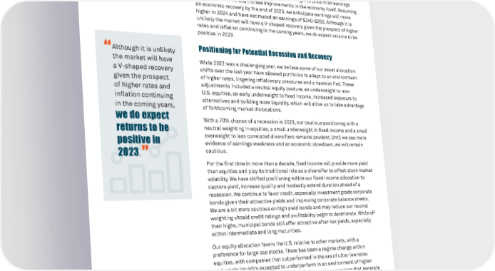 9 2023 OUTLOOK Our 2023 year-end range for the S&P 500 is wide at 3,800 – 4,500, reflecting the considerable macro-uncertainty ahead. Based on the midpoint of this range, that’s a gain of about 9% from today’s S&P 500 level of about 3,800. Markets are discounting mechanisms and will begin to price in an earnings recovery before we start to see improvements in the economy itself. Assuming an economic recovery by the end of 2023, we anticipate earnings will move higher in 2024 and have estimated an earnings of $240-$250. Although it is unlikely the market will have a V-shaped recovery given the prospect of higher rates and inflation continuing in the coming years, we do expect returns to be positive in 2023. “Although it is unlikely Positioning for Potential Recession and Recovery the market will have While 2022 was a challenging year, we believe some of our asset allocation a V-shaped recovery shifts over the last year have allowed portfolios to adapt to an environment given the prospect of higher rates, lingering inflationary pressures and a hawkish Fed. These of higher rates and adjustments included a neutral equity posture, an underweight to non- inflation continuing U.S. equities, an early underweight to fixed income, increased exposure to alternatives and building more liquidity, which will allow us to take advantage in the coming years, of forthcoming market dislocations. we do expect With a 70% chance of a recession in 2023, our cautious positioning with a returns to be neutral weighting in equities, a small underweight in fixed income and a small positive in overweight to less correlated diversifiers remains prudent. Until we see more evidence of earnings weakness and an economic slowdown, we will remain 2023.” cautious. For the first time in more than a decade, fixed income will provide more yield than equities and play its traditional role as a diversifier to offset stock market volatility. We have shifted positioning within our fixed income allocation to capture yield, increase quality and modestly extend duration ahead of a recession. We continue to favor credit, especially investment grade corporate bonds given their attractive yields and improving corporate balance sheets. We are a bit more cautious on high yield bonds and may reduce our neutral weighting should credit ratings and profitability begin to deteriorate. While off their highs, municipal bonds still offer attractive after-tax yields, especially within intermediate and long maturities. Our equity allocation favors the U.S. relative to other markets, with a preference for large cap stocks. There has been a regime change within equities, with companies that outperformed in the era of ultra-low rates and ample liquidity expected to underperform in an environment of higher borrowing costs and lingering inflation. High-quality companies that generate strong cash flows and profits, as well as those that offer sustained dividend growth, should provide better value. Although we maintain a small underweight to non-U.S. equities, there is the potential to increase exposure to beaten down areas of the market in the new year, especially if the U.S. dollar’s strength softens. This could occur as the U.S. economy slows and interest rate differentials begin to converge as the Fed nears the end of its tightening cycle. We are also watching for opportunities in small cap stocks, which tend to outperform large caps when bear markets end.