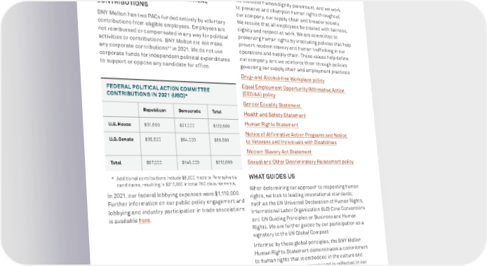 BNY MELLON ENTERPRISE ESG 86 GLOBAL CITIZENSHIP with BNY Mellon’s Code of Conduct, internal policies and procedures, applicable laws and regulations, and in consultation with the Compliance and Legal Departments. EMPLOYEE-FUNDED POLITICAL ACTION COMMITTEES AND POLITICAL CONTRIBUTIONS BNY Mellon has two PACs funded entirely by voluntary contributions from eligible employees. Employees are not reimbursed or compensated in any way for political activities or contributions. BNY Mellon did not make any corporate contributions 43 in 2021. We do not use corporate funds for independent political expenditures to support or oppose any candidate for office. FEDERAL POLITICAL ACTION COMMITTEE CONTRIBUTIONS IN 2021 (USD)* Republican Democratic To t a l U.S. House $ 31,50 0 $91,000 $122,500 U.S. Senate $35,500 $54,000 $89,500 To t a l $67,000 $145,000 $212,000 * A dditional contributions include $5,000 made to Pennsylvania candidates, resulting in $217,000 in total PAC disbursements. In 2021, our federal lobbying expenses were $1,110,000. Further information on our public policy engagement and lobbying and industry participation in trade associations is available here . 43 A corpor ate contribution is defined to include a state candidate committee, a 501(c) 4, 527 or ballot initiatives. PROTECTING HUMAN RIGHTS Our Opportunity and Approach We consider human dignity paramount, and we work to preserve and champion human rights throughout our company, our supply chain and broader society. We require that all employees be treated with fairness, dignity and respect at work. We are committed to preserving human rights by instituting policies that help prevent modern slavery and human trafficking in our operations and supply chain. These values help define our company, and we reinforce them through policies governing our supply chain and employment practices: Drug- and Alcohol-free Workplace policy Equal Employment Opportunity/Affirmative Action (EEO/AA) policy Gender Equality Statement Health and Safety Statement Human Rights Statement Notice of Affirmative Action Programs and Notice to Veterans and Individuals with Disabilities Modern Slavery Act Statement Sexual and Other Discriminatory Harassment policy WHAT GUIDES US When determining our approach to respecting human rights, we look to leading international standards, such as the UN Universal Declaration of Human Rights, International Labor Organization (ILO) Core Conventions and UN Guiding Principles on Business and Human Rights. We are further guided by our participation as a signatory to the UN Global Compact. Informed by these global principles, the BNY Mellon Human Rights Statement demonstrates a commitment to human rights that is embedded in the culture and values that define our company and is reflected in our policies and actions toward our employees, suppliers, clients and the communities and countries where we do business and throughout our value chain. This statement was updated and approved in February 2022. Our expanded statement clarifies its scope with direct links to the UK and Australia Modern Slavery Acts,
