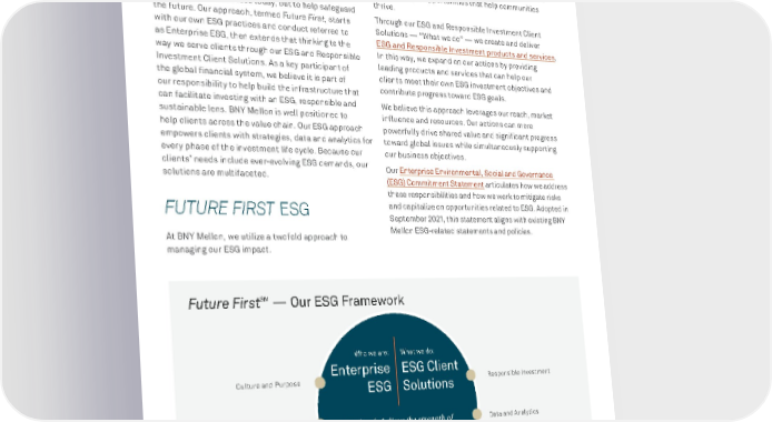 BNY MELLON ENTERPRISE ESG 8 APPROACH PUTTING THE FUTURE FIRST SM At BNY Mellon, we’re committed to putting the Future First by using our global reach, influence and resources not just to power success today, but to help safeguard the future. Our approach, termed Future First , starts with our own ESG practices and conduct referred to as Enterprise ESG, then extends that thinking to the way we serve clients through our ESG and Responsible Investment Client Solutions. As a key participant of the global financial system, we believe it is part of our responsibility to help build the infrastructure that can facilitate investing with an ESG, responsible and sustainable lens. BNY Mellon is well positioned to help clients across the value chain. Our ESG approach empowers clients with strategies, data and analytics for every phase of the investment life cycle. Because our clients’ needs include ever-evolving ESG demands, our solutions are multifaceted. FUTURE FIRST ESG At BNY Mellon, we utilize a twofold approach to managing our ESG impact. Through Enterprise ESG —“Who we are” — we seek to integrate an ESG lens across our enterprise. Delivering on our ESG framework, we Consider Everything SM , starting with our own enterprise-wide practices, considering our business impacts on global issues and contributing to opportunities that help communities thrive. Through our ESG and Responsible Investment Client Solutions — “What we do” — we create and deliver ESG and Responsible Investment products and services . In this way, we expand on our actions by providing leading products and services that can help our clients meet their own ESG investment objectives and contribute progress toward ESG goals. We believe this approach leverages our reach, market influence and resources. Our actions can more powerfully drive shared value and significant progress toward global issues while simultaneously supporting our business objectives. Our Enterprise Environmental, Social and Governance (ESG) Commitment Statement articulates how we address these responsibilities and how we work to mitigate risks and capitalize on opportunities related to ESG. Adopted in September 2021, this statement aligns with existing BNY Mellon ESG-related statements and policies. Fu ture First SM — Our ESG Framework Who we are: Enterprise ESG What we do: ESG Client Solutions We firmly believe the strength of our client solutions is underpinned by our own actions and behavior as an enterprise. Culture and Purpose Responsible Investment Responsible Business Data and Analytics Global Citizenship Financing and Payments