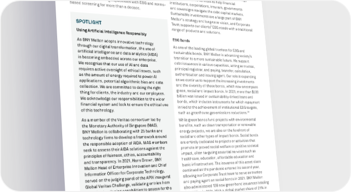 BNY MELLON ENTERPRISE ESG 61 RESPONSIBLE BUSINESS SERVING CLIENTS ACROSS THE INVESTMENT LIFE CYCLE With our clients integrating ESG considerations across various stages of the investment life cycle, we recognize the importance of developing solutions with this in mind. We have offered our institutional client base investment compliance monitoring capabilities with ESG and norms- based screening for more than a decade. SPOTLIGHT Using Artificial Intelligence Responsibly As BNY Mellon adopts innovative technology through our digital transformation, the use of artificial intelligence and data analytics (AIDA) is becoming embedded across our enterprise. We recognize that our use of AI and data requires active oversight of ethical issues, such as the amount of energy required to power AI applications, potential algorithmic bias and data collection. We are committed to doing the right thing for clients, the industry and our employees. We acknowledge our responsibilities to the wider financial system and look to ensure the ethical use of this technology. As a member of the Veritas consortium led by the Monetary Authority of Singapore (MAS), BNY Mellon is collaborating with 25 banks and technology firms to develop a framework around the responsible adoption of AIDA. MAS members seek to assess their AIDA solutions against the principles of fairness, ethics, accountability and transparency. In 2021, Hans Brown, BNY Mellon Head of Enterprise Innovation and Chief Information Officer for Corporate Technology, served on the judging panel of the APIX inaugural Global Veritas Challenge, validating entries from fintechs developing capabilities to assess for the fairness of AI applications in banking. In addition to judging this industry competition, BNY Mellon was a leading participant in the Singapore FinTech Festival, a five-day virtual event that attracted more than 60,000 participants from over 160 countries in November 2021. Issuer Services CORPORATE TRUST Corporate Trust offers the infrastructure, technology and administrative services to help financial institutions, corporations, insurers, governments and sovereigns navigate the debt capital markets. Sustainable investments are a large part of BNY Mellon’s strategy and long-term vision, and Corporate Trust supports our clients’ ESG needs with a traditional range of products and solutions. ESG Bonds As one of the leading global trustees for ESG and sustainable bonds, BNY Mellon is advancing society’s transition to a more sustainable future. We support debt issuances in various capacities, acting as trustee, principal registrar, and paying, transfer, calculation, authentication and issuing agent. Our role is expanding as we continue to support the increasing investments and the diversity of these bonds, which now encompass green, social and impact bonds. In 2021, more than $530 billion was issued in sustainability-linked loans and bonds, which includes instruments for which repayment is tied to the achievement of institutional ESG targets, such as greenhouse gas emissions reductions. 26 26 Sustainable Debt Issuance Breezed Past $1.6 Trillion in 2021 , Bloomberg NEF, Jan. 12, 2022 27 Social and green bond data reflective of FY 2021; Dealogic and Refinitiv. While green bonds fund projects with environmental benefits, such as clean transportation or renewable energy projects, we are also on the forefront of social and other types of impact bonds. Social bonds are entirely dedicated to projects or activities that promote improved social welfare or positive societal impact, often targeting essential services such as healthcare, education, affordable education and basic infrastructure. The issuance of this asset class continued as the pandemic entered its second year, allowing our Corporate Trust team to serve as trustee and paying agent on social bonds in 2021. BNY Mellon also administered 138 new green bond issuances totaling $62 billion in 2021. With a global market share of 21% in deal count origination, we are one of the leading trustees in green bonds by deal volume. 27 By working with clients whose investments are intended to deliver environmental and social benefits, we use our global reach to drive positive change.