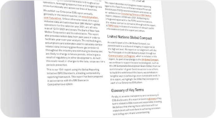 BNY MELLON ENTERPRISE ESG 2 ABOUT THIS REPORT ABOUT THIS REPORT This is BNY Mellon’s 15th report covering environmental, social and governance (ESG) topics. Our annual updates in this report are not just about our company’s environmental and social impact, but also about how we view and integrate ESG considerations throughout our operations, leveraging opportunities and mitigating risks cross-functionally and across our lines of business. We publish our Enterprise ESG report annually, generally in the second quarter, on www.bnymellon. com/futurefirst . Unless otherwise noted, this report includes data and activities from BNY Mellon’s global operations for the calendar year 2021, and all data is as of 12/31/2021 and covers The Bank of New York Mellon Corporation and its subsidiaries. The report also provides select data from past years in order to facilitate year-over-year analysis. The methodologies, assumptions and estimates used to calculate climate- related data (including greenhouse gas emissions) throughout the industry are continuing to develop and are likely to change in future periods, including as a result of regulatory or other developments. As such, this could result in changes to the data, scope and time periods presented. This is our 13th report using the Global Reporting Initiative (GRI) Standards, a leading sustainability reporting framework. This report has been prepared in accordance with the GRI Standards Comprehensive option. NEW IN THIS REPORT This report describes our progress toward reporting against the Task Force on Climate-related Financial Disclosures (TCFD) recommendations and serves as an update to our Considering Climate at BNY Mellon report, released in February 2021. Reflecting our integrated approach to the TCFD recommendations, the related content is contained throughout this report. A TCFD Index indicates the location of relevant public information in both this report and others. United Nations Global Compact As a participant of the UN Global Compact, our commitment to a culture of integrity is supported at the highest level. We report on our alignment with the Ten Principals of the UN Global Compact through our Communication on Progress , which is included in this report. As part of our pledge to the UN Global Compact , we continue to support broader societal goals, such as the UN Sustainable Development Goals (SDGs). From our administration of green bond issuances to our efforts to build the workforce of the future, we contribute in tangible ways to achieving a more sustainable world. In this report, we highlight the SDGs that correspond to each of our Enterprise ESG pillars. Glossary of Key Terms Finally, to advance transparency and consistency in ESG disclosures, this report includes a glossary of key terms related to ESG issues and responsible investing. We believe that sharing these definitions with our stakeholders will contribute to achieving consistent terminology and shared understanding. We welcome your comments about this or any of our reports via the contact form on our website. Task Force on Climate-related Financial Disclosures (TCFD)