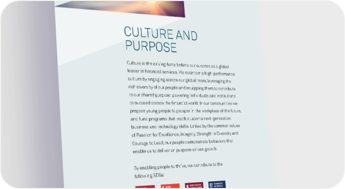 CULTURE AND PURPOSE Culture is the driving force behind our success as a global leader in financial services. We maintain a high-performance culture by engaging across our global team, leveraging the rich diversity of our people and equipping them to contribute to our shared purpose: powering individuals and institutions to succeed across the financial world. In our communities we prepare young people to prosper in the workplace of the future, and fund programs that teach students next-generation business and technology skills. United by the common values of Passion for Excellence, Integrity, Strength in Diversity and Courage to Lead, our people demonstrate behaviors that enable us to deliver on purpose-driven growth. By enabling people to thrive, we contribute to the following SDGs: