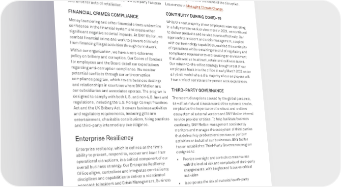 BNY MELLON ENTERPRISE ESG 45 RESPONSIBLE BUSINESS report, including an Ethics Helpline, operated by the BNY Mellon Ethics Office, and an Ethics Hotline, operated by an independent administrator. Anyone who reports a concern or reports misconduct in good faith, and with the reasonable belief that the information is true, is demonstrating a commitment to our values and following our Code. The company has zero tolerance for acts of retaliation. FINANCIAL CRIMES COMPLIANCE Money laundering and other financial crimes undermine confidence in the financial system and create other significant negative societal impacts. At BNY Mellon, we combat financial crime and work to prevent criminals from financing illegal activities through our network. Within our organization, we have a zero-tolerance policy on bribery and corruption. Our Codes of Conduct for employees and the Board detail our expectations regarding anti-corruption compliance. We monitor potential conflicts through our anti-corruption compliance program, which covers business dealings and relationships in countries where BNY Mellon and our subsidiaries and associates operate. The program is designed to comply with both U.S. and non-U.S. laws and regulations, including the U.S. Foreign Corrupt Practices Act and the UK Bribery Act. It covers business activities and regulatory requirements, including gifts and entertainment, charitable contributions, hiring practices and third-party intermediary due diligence. Enterprise Resiliency Enterprise resiliency, which is defined as the firm’s ability to prevent, respond to, recover and learn from operational disruptions, is a critical component of our overall business strategy. Our Enterprise Resiliency Office aligns, centralizes and integrates our resiliency disciplines and capabilities to deliver a coordinated approach toIncident and Crisis Management, Business Continuity and Disaster Recovery. As a global institution, BNY Mellon is exposed to unforeseeable and uncontrollable events that could cause varying degrees of disruption to normal business processes. Our Enterprise Resiliency Office maintains a Business Continuity Program (BCP) focused on designing and building response capabilities to navigate business disruptions. The BCP is implemented through an “all- hazards” planning approach with objectives including minimizing the impact of disruptions and facilitating service continuity within recovery time objectives and based on prioritization of business objectives and operations, regardless of the cause of the disruption. Learn more in Managing Climate Change . CONTINUITY DURING COVID-19 While the vast majority of our employees were operating in a fully remote work environment in 2021, we continued to deliver products and service clients effectively. Our approach to incident and crisis management, coupled with our technology capabilities, enabled the continuity of operations while remaining mindful of regulatory and compliance requirements and creating an environment that allowed us to attract, retain and cultivate talent. Our return-to-the-office strategy brought most of our employees back into the office in early March 2022 under a hybrid model where the majority of our employees will have a mix of remote and in-person work experiences. THIRD-PARTY GOVERNANCE The recent disruptions caused by the global pandemic, as well as natural disasters and other systemic shocks, emphasize the importance of a robust and resilient ecosystem of external vendors and BNY Mellon internal service provider entities. To help facilitate business continuity, BNY Mellon management consistently monitors and manages the ecosystem of third parties that deliver key products and services or perform activities on behalf of our businesses. BNY Mellon has an established Third-Party Governance program designed to: • Provide oversight and controls commensurate with the level of risk and complexity of third-party engagements, with heightened focus on critical activities • Incorporate the risk of material fourth-party exposure • Meet evolving legal and regulatory requirements as well as stakeholder expectations on ESG issues At the same time, we share with suppliers our expectations on the management of ESG issues, which now go beyond sustainability and transparency. We seek