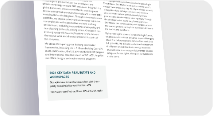 BNY MELLON ENTERPRISE ESG 83 GLOBAL CITIZENSHIP Leadership in Energy and Environmental Design (LEED) environmental certifications at both sites. We also progressed relocation of our offices in Brussels and are seeking an Excellent rating from the BREEAM sustainability assessment certification program for that facility, to be occupied in 2022. The design of our workspaces contributes to the wellbeing and productivity of our employees, and affects our energy use and GHG emissions. In light of the global pandemic, we are committed to providing work environments that are environmentally and economically sustainable for the long term. Throughout our real estate portfolio, we implemented various measures to provide our employees with a productive and safe working environment, including improved indoor air quality and new cleaning protocols, among others. Changes in this evolving space will have implications for the future of the way we work and the environmental footprint of the company. We utilize third-party green building certification frameworks, including the U.S. Green Building Council’s LEED certification, the U.S. EPA’s ENERGY STAR program and international standards such as ISO 14001, to guide our office designs and environmental programs. 2021 KEY DATA: REAL ESTATE AND WORKSPACES Occupied real estate by square foot with third- party sustainability certification: 48% ISO 14001-certified facilities: 92% in EMEA region SUPPLY CHAIN Our Opportunity and Approach As a major global financial services leader operating in 35 countries, BNY Mellon touches much of the world’s asset movements every day. We rely on a broad network of suppliers for a variety of products and services to support our company and successfully deliver products and services to our clients globally. Through the development of sound supplier relationships, BNY Mellon can continue to improve our performance and market position, and uphold our responsibilities to the market and our clients. By harnessing the power of our purchasing influence, we also seek to cultivate a diverse, responsible supply chain that helps people and communities reach their full potential. We strive to conduct our business with the highest ethical standards, manage social and environmental issues responsibly, manage risks and safeguard human rights. We expect our suppliers to do the same.