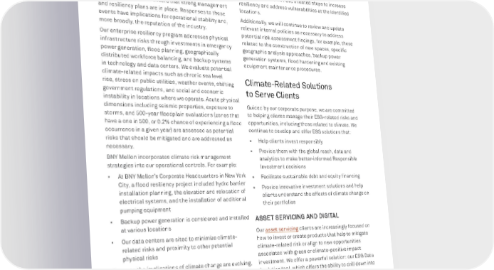 BNY MELLON ENTERPRISE ESG 78 GLOBAL CITIZENSHIP FACILITIES MANAGEMENT OPERATIONAL RESPONSE TO CLIMATE CHANGE RISKS BNY Mellon recognizes that climate change is amplifying operational risk exposure due to disruptive weather patterns and events. Additionally, precipitation and temperature extremes including floods, fires and storms prompt companies to ensure that strong management and resiliency plans are in place. Responses to these events have implications for operational stability and, more broadly, the reputation of the industry. Our enterprise resiliency program addresses physical infrastructure risks through investments in emergency power generation, flood planning, geographically distributed workforce balancing, and backup systems in technology and data centers. We evaluate potential climate-related impacts such as chronic sea level rise, stress on public utilities, weather events, shifting government regulations, and social and economic instability in locations where we operate. Acute physical dimensions including seismic properties, exposure to storms, and 500-year floodplain evaluations (zones that have a one in 500, or 0.2% chance of experiencing a flood occurrence in a given year) are assessed as potential risks that should be mitigated and are addressed as necessary. BNY Mellon incorporates climate risk management strategies into our operational controls. For example: • At BNY Mellon’s Corporate Headquarters in New York City, a flood resiliency project included hydro barrier installation planning, the elevation and relocation of electrical systems, and the installation of additional pumping equipment • Backup power generation is considered and installed at various locations • Our data centers are sited to minimize climate- related risks and proximity to other potential physical risks Because the implications of climate change are evolving, we continuously evaluate potential emerging impacts and develop corresponding appropriate actions. In 2021, BNY Mellon took two key steps in support of this. BNY Mellon has conducted a detailed climate risk and resiliency assessment of our real estate portfolio in both its current and future states. This study has identified potential vulnerabilities within our physical real estate portfolio that could impact business continuity and impose costs on BNY Mellon. Vulnerabilities to extreme weather events have been recently observed, such as the 2021 Texas winter storm and subsequent power crisis, and 2021 Luxembourg flood. As a result of this assessment, we have initiated steps to increase resiliency and address vulnerabilities at the identified locations. Additionally, we will continue to review and update relevant internal policies as necessary to address potential risk assessment findings, for example, those related to the construction of new spaces, specific geographic analysis approaches, backup power generation systems, flood hardening and existing equipment maintenance procedures. Climate-Related Solutions to Serve Clients Guided by our corporate purpose, we are committed to helping clients manage their ESG-related risks and opportunities, including those related to climate. We continue to develop and offer ESG solutions that: • Help clients invest responsibly • Provide them with the global reach, data and analytics to make better-informed Responsible Investment decisions • Facilitate sustainable debt and equity financing • Provide innovative investment solutions and help clients understand the effects of climate change on their portfolios ASSET SERVICING AND DIGITAL Our asset servicing clients are increasingly focused on how to invest or create products that help to mitigate climate-related risk or align to new opportunities associated with green or climate-positive impact investment. We offer a powerful solution: our ESG Data Analytics tool, which offers the ability to drill down into specific climate-related metrics.