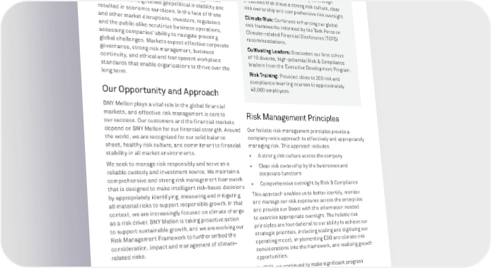 BNY MELLON ENTERPRISE ESG 42 RESPONSIBLE BUSINESS RISK MANAGEMENT Social, political, environmental and financial turbulence has continued to impact economies and communities. The global pandemic entered year two, climate change concerns escalated, and Russian aggression in Ukraine has heightened geopolitical instability and resulted in economic sanctions. In the face of these and other market disruptions, investors, regulators and the public alike scrutinize business operations, assessing companies’ ability to navigate pressing global challenges. Markets expect effective corporate governance, strong risk management, business continuity, and ethical and transparent workplace standards that enable organizations to thrive over the long term. Our Opportunity and Approach BNY Mellon plays a vital role in the global financial markets, and effective risk management is core to our success. Our customers and the financial markets depend on BNY Mellon for our financial strength. Around the world, we are recognized for our solid balance sheet, healthy risk culture, and commitment to financial stability in all market environments. We seek to manage risk responsibly and serve as a reliable custody and investment source. We maintain a comprehensive and strong risk management framework that is designed to make intelligent risk-based decisions by appropriately identifying, measuring and mitigating all material risks to support responsible growth. In that context, we are increasingly focused on climate change as a risk driver. BNY Mellon is taking proactive action to support sustainable growth, and we are evolving our Risk Management Framework to further embed the consideration, impact and management of climate- related risks. 2021 ACHIEVEMENTS Risk Management: Continued to implement holistic risk management principles through initiatives that drove a strong risk culture, clear risk ownership and comprehensive risk oversight. Climate Risk: Continued enhancing our global risk frameworks informed by the Task Force on Climate-related Financial Disclosures (TCFD) recommendations. Cultivating Leaders: Graduated our first cohort of 10 diverse, high-potential Risk & Compliance leaders from the Executive Development Program. Risk Training: Provided close to 200 risk and compliance learning courses to approximately 49,600 employees. Risk Management Principles Our holistic risk management principles provide a company-wide approach to effectively and appropriately managing risk. This approach includes: • A strong risk culture across the company • Clear risk ownership by the businesses and corporate functions • Comprehensive oversight by Risk & Compliance This approach enables us to better identify, monitor and manage our risk exposures across the enterprise and provide our Board with the information needed to exercise appropriate oversight. The holistic risk principles are foundational to our ability to achieve our strategic priorities, including scaling and digitizing our operating model, implementing ESG and climate risk considerations into the framework, and realizing growth opportunities. In 2021, we continued to make significant progress toward multiple priority initiatives including: Enterprise Limit Framework. We operationalized by business and legal entity the enterprise limit framework implemented in 2020, driving enterprise-wide consistency and strengthening the linkage between business risk management and corporate risk appetite.