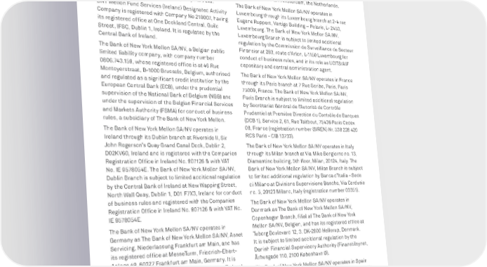 BNY MELLON ENTERPRISE ESG 118 APPENDIX Investment management services are offered through BNY Mellon Investment Management EMEA Limited, BNY Mellon Centre, One Canada Square, London E14 5AL, which is registered in England No. 1118580 and is authorised and regulated by the Financial Conduct Authority. Offshore trust and administration services are through BNY Mellon Trust Company (Cayman) Ltd. BNY Mellon Fund Services (Ireland) Designated Activity Company is registered with Company No 218007, having its registered office at One Dockland Central, Guild Street, IFSC, Dublin 1, Ireland. It is regulated by the Central Bank of Ireland. The Bank of New York Mellon SA/NV, a Belgian public limited liability company, with company number 0806.743.159, whose registered office is at 46 Rue Montoyerstraat, B-1000 Brussels, Belgium, authorised and regulated as a significant credit institution by the European Central Bank (ECB), under the prudential supervision of the National Bank of Belgium (NBB) and under the supervision of the Belgian Financial Services and Markets Authority (FSMA) for conduct of business rules, a subsidiary of The Bank of New York Mellon. The Bank of New York Mellon SA/NV operates in Ireland through its Dublin branch at Riverside II, Sir John Rogerson’s Quay Grand Canal Dock, Dublin 2, D02KV60, Ireland and is registered with the Companies Registration Office in Ireland No. 907126 & with VAT No. IE 9578054E. The Bank of New York Mellon SA/NV, Dublin Branch is subject to limited additional regulation by the Central Bank of Ireland at New Wapping Street, North Wall Quay, Dublin 1, D01 F7X3, Ireland for conduct of business rules and registered with the Companies Registration Office in Ireland No. 907126 & with VAT No. IE 9578054E. The Bank of New York Mellon SA/NV operates in Germany as The Bank of New York Mellon SA/NV, Asset Servicing, Niederlassung Frankfurt am Main, and has its registered office at MesseTurm, Friedrich-Ebert- Anlage 49, 60327 Frankfurt am Main, Germany. It is subject to limited additional regulation by the Federal Financial Supervisory Authority (Bundesanstalt für Finanzdienstleistungsaufsicht, Marie-Curie-Str. 24-28, 60439 Frankfurt, Germany) under registration number 122721. The Bank of New York Mellon SA/NV operates in the Netherlands through its Amsterdam branch at Strawinskylaan 337, WTC Building, Amsterdam, 1077 XX, the Netherlands. The Bank of New York Mellon SA/NV, Amsterdam Branch is subject to limited additional supervision by the Dutch Central Bank (“De Nederlandsche Bank” or “DNB”) on integrity issues only (registration number 34363596). DNB holds office at Westeinde 1, 1017 ZN Amsterdam, the Netherlands. The Bank of New York Mellon SA/NV operates in Luxembourg through its Luxembourg branch at 2-4 rue Eugene Ruppert, Vertigo Building – Polaris, L- 2453, Luxembourg. The Bank of New York Mellon SA/NV, Luxembourg Branch is subject to limited additional regulation by the Commission de Surveillance du Secteur Financier at 283, route d’Arlon, L-1150 Luxembourg for conduct of business rules, and in its role as UCITS/AIF depositary and central administration agent. The Bank of New York Mellon SA/NV operates in France through its Paris branch at 7 Rue Scribe, Paris, Paris 75009, France. The Bank of New York Mellon SA/NV, Paris Branch is subject to limited additional regulation by Secrétariat Général de l’Autorité de Contrôle Prudentiel at Première Direction du Contrôle de Banques (DCB 1), Service 2, 61, Rue Taitbout, 75436 Paris Cedex 09, France (registration number (SIREN) Nr. 538 228 420 RCS Paris - CIB 13733). The Bank of New York Mellon SA/NV operates in Italy through its Milan branch at Via Mike Bongiorno no. 13, Diamantino building, 5th floor, Milan, 20124, Italy. The Bank of New York Mellon SA/NV, Milan Branch is subject to limited additional regulation by Banca d’Italia - Sede di Milano at Divisione Supervisione Banche, Via Cordusio no. 5, 20123 Milano, Italy (registration number 03351). The Bank of New York Mellon SA/NV operates in Denmark as The Bank of New York Mellon SA/NV, Copenhagen Branch, filial af The Bank of New York Mellon SA/NV, Belgien, and has its registered office at Tuborg Boulevard 12, 3. DK-2900 Hellerup, Denmark. It is subject to limited additional regulation by the Danish Financial Supervisory Authority (Finanstilsynet, Århusgade 110, 2100 København Ø). The Bank of New York Mellon SA/NV operates in Spain through its Madrid branch with registered office at Calle José Abascal 45, Planta 4ª, 28003, Madrid, and enrolled on the Reg. Mercantil de Madrid, Tomo 41019, folio 185 (M-727448). The Bank of New York Mellon, Sucursal en España is registered with Banco de España (registration number 1573).