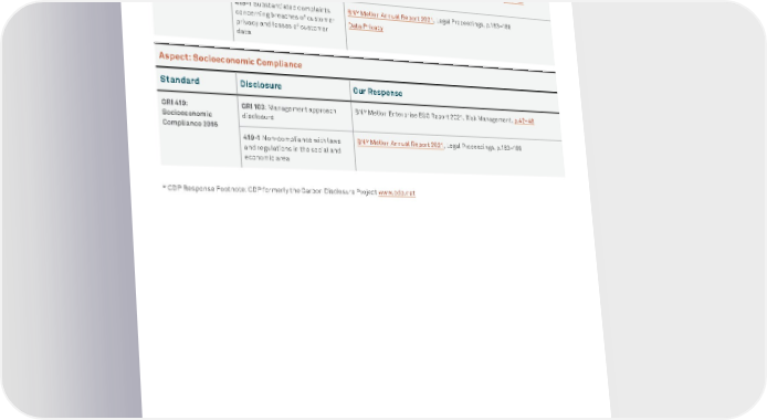 BNY MELLON ENTERPRISE ESG 106 APPENDIX Aspect: Customer Privacy Standard Disclosure Our Response GRI 418: Customer Privacy 2016 GRI 103: Management approach disclosure BNY Mellon Enterprise ESG Report 2021, Risk Management, p.42–48 418-1 Substantiated complaints concerning breaches of customer privacy and losses of customer data BNY Mellon Annual Report 2021 , Legal Proceedings, p.183–186 Data Privacy Aspect: Socioeconomic Compliance Standard Disclosure Our Response GRI 419: Socioeconomic Compliance 2016 GRI 103 : Management approach disclosure BNY Mellon Enterprise ESG Report 2021, Risk Management, p.42–48 419 -1 Non-compliance with laws and regulations in the social and economic area BNY Mellon Annual Report 2021 , Legal Proceedings, p.183–186 * CDP Response Footnote: CDP formerly the Carbon Disclosure Project www.cdp.net