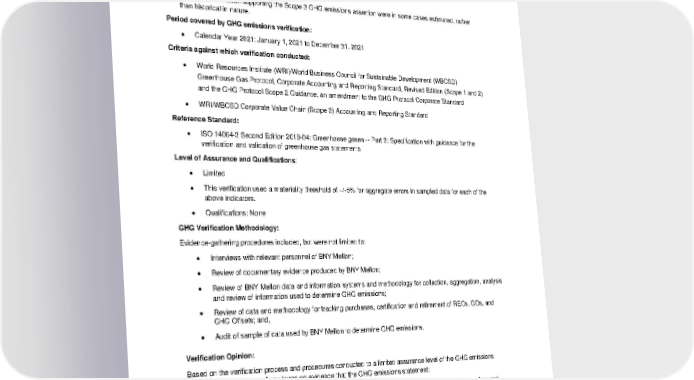 P age 2 Data and information supp or tin g the Scope 1 an d Scope 2 GHG emissions assertion w ere in most cases historical in nature , but in some cases estimated . Data and information supporting the Scope 3 GHG emissions assertion were in some cases estimated , rather than historical in nature . Per iod covered by G HG emissions verif icatio n : • Calendar Year 20 2 1 : January 1 , 2 0 2 1 to December 31, 20 2 1 Criter ia against which verification c onducted: • World Resources Institute (WRI)/World Busin es s C ouncil for Sustainable Develop ment (WBCSD) Greenhouse G as Pr otocol , Corporat e Accounting and Reporting Standard , Revised Edition (Scope 1 and 2) and the GHG Protocol Scope 2 Guidance, an amendment to the GHG Protocol Corporate Standard • WR I/WBCS D Corporate Value Cha in (Sc ope 3) Accounting and Reporting Standard R efe rence Standard : • ISO 14064 - 3 Second Editi on 2019 - 04 : Greenhouse gases -- Part 3: S pe ci f ication wi t h gu i dance for the ve rification a nd valid a tion of greenhouse g as state ment s Le vel of Assurance and Qual ificat ions : • Limited • This verifica tion used a mate ri ali ty threshold of +/ - 5% for aggregate errors in sampled data for each of the abo ve indic at or s . • Q ualificat ions: None GHG Verification M e thodology: Evidence - ga thering procedures included , but were not limited to: • Interviews with r elevan t personnel of BN Y M ellon ; • Review of documentary evid ence prod uc ed by BNY Mellon ; • Revie w o f BNY Mellon data and information sy s t em s and methodology fo r collectio n, aggregation, analysis and review of inform ation used to determ ine GHG em ission s ; • Review of data and meth od olo gy for tracking purchases, certification an d retirement of RECs, GOs, and GHG Offsets; and, • A u dit of sample of d ata used by BNY Mellon to determine GHG emissions. Verification Opinion: Based on the verification process and procedu r es conducted to a li mi t ed assurance level of the GHG emissions state me nt shown above, Apex found no evi dence that the GHG emissions statement : • is n ot mate rially correc t and is not a fair r e presentation of the GHG em ission s d a ta and information; and • has no t been prepared in a c co r d ance with the WRI/WBCSD G HG Protocol Corporat e Acco un ti n g and Reporting Standar d ( Scop e 1 and 2 ), and W RI/WBCSD Green house Gas Protocol Corpora te Value Chain Accoun ting and Reporting Standar d (Sco pe 3) .