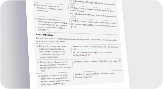 BNY MELLON ENTERPRISE ESG 110 APPENDIX Risk Management Disclose how the organization identifies, assesses and manages climate-related risks. a) Describe the organization’s processes for identifying and assessing climate-related risks. BNY Mellon Enterprise ESG Report 2021, Climate Change-Driven and ESG Risks p.48 BNY Mellon Enterprise ESG Report 2021, Climate Risk Management p.71-79 b) Describe the organization’s processes for managing climate- related risks. BNY Mellon Enterprise ESG Report 2021, Climate Change-Driven and ESG Risks p.48 BNY Mellon Enterprise ESG Report 2021, Climate Risk Management p.71-7 5 c) Describe how processes for identifying, assessing and managing climate-related risks are integrated into the organization’s overall risk management. BNY Mellon Enterprise ESG Report 2021, Risk Management p.42-43 BNY Mellon Enterprise ESG Report 2021, Climate Risk Management p .7 2-74 Metrics and Targets Disclose the metrics and targets used to assess and manage relevant climate-related risks and opportunities where such information is material. a) Disclose the metrics used by the organization to assess climate- related risks and opportunities in line with its strategy and risk management process. BNY Mellon Enterprise ESG Report 2021, Climate Risk Management p.75 B NY Mellon Enterprise ESG Report 2021, Environmental Sustainability p.79-83 b) Disclose Scope 1, Scope 2, and if appropriate, Scope 3 Greenhouse Gas (GHG) emissions, and the related risks. BNY Mellon Enterprise ESG Report 2021, GHG Emissions table p .111 c) Describe the targets used by the organization to manage climate- related risks and opportunities and performance against targets. BNY Mellon Enterprise ESG Report 2021, Environmental Sustainability, p.80–81