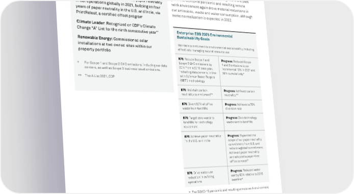 BNY MELLON ENTERPRISE ESG 80 GLOBAL CITIZENSHIP 2021 ACHIEVEMENTS Carbon Neutral: Achieved carbon neutrality in our operations for the seventh consecutive year * Global Paper Neutrality: Achieved paper neutrality in our operations globally in 2021, building on four years of paper neutrality in the U.S. and India, via PrintReleaf, a certified offset program Climate Leader : Recognized on CDP’s Climate Change “A” List for the ninth consecutive year ** Renewable Energy: Commissioned solar installations at two owned sites within our property portfolio * F or Scope 1 and Scope 2 GHG emissions, including our data centers, as well as Scope 3 business travel emissions. ** T he A List 2021, CDP 2025 Environmental Sustainability Goals We continue to work toward our Enterprise ESG 2025 goals and have made substantial progress in the past year. The COVID-19 pandemic and resulting remote work environment again drove material reductions in our emissions, waste and water consumption, although some normalization is expected in 2022. Enterprise ESG 2025 Environmental Sustainability Goals Maintain commitment to environmental sustainability, including effectively managing natural resource use KPI: Reduce Scope 1 and Scope 2 GHG emissions by 20% from a 2018 base year, including data centers, in line with Science-Based Targets (SBTi) methodology Progress: Reduced Scope 1 and 2 emissions by an incremental 12% in 2021 and 36% cumulatively * KPI: Maintain carbon neutrality commitment ** Progress: Achieved carbon neutrality ** KPI: Divert 80% of office waste from landfills Progress: Achieved a 75% diversion rate KPI: Target zero waste to landfills for technology equipment Progress: Zero technology waste sent to landfills KPI: Achieve paper neutrality in the U.S. and India Progress: Expanded the scope of our paper neutrality commitment from U.S. and India to a global commitment. Achieved paper neutrality and adopted a paper-free office concept * KPI: Drive water use reduction in building operations Progress: Reduced water use by 60% relative to 2015 baseline * * T he COVID-19 pandemic and resulting remote work environment helped drive material reductions. ** F or Scope 1 and Scope 2 GHG emissions, including our data centers, as well as Scope 3 business travel emissions.