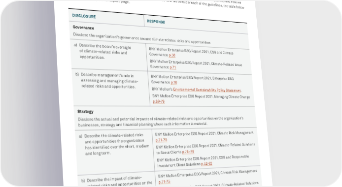 BNY MELLON ENTERPRISE ESG 109 APPENDIX TASK FORCE ON CLIMATE-RELATED FINANCIAL DISCLOSURES RECOMMENDATIONS INDEX We publicly stated our support for the TCFD recommendations in 2019. For background on our journey and how we consider climate, please see page 17 . For information about how we consider each of the guidelines, the table below references the specific Report page. DISCLOSURE RESPONSE Governance Disclose the organization’s governance around climate-related risks and opportunities a) Describe the board’s oversight of climate-related risks and opportunities. BNY Mellon Enterprise ESG Report 2021, ESG and Climate Governance p.50 BNY Mellon Enterprise ESG Report 2021, Climate-Related Issue Governance p.71 b) Describe management’s role in assessing and managing climate- related risks and opportunities. BNY Mellon Enterprise ESG Report 2021, Enterprise ESG Governance p .16 BNY Mellon’s Environmental Sustainability Policy Statement . BNY Mellon Enterprise ESG Report 2021, Managing Climate Change p . 6 9 -7 9 Strategy Disclose the actual and potential impacts of climate-related risks and opportunities on the organization’s businesses, strategy and financial planning where such information is material. a) Describe the climate-related risks and opportunities the organization has identified over the short, medium and long term. BNY Mellon Enterprise ESG Report 2021, Climate Risk Management p.71-7 5 BNY Mellon Enterprise ESG Report 2021, Climate-Related Solutions to Serve Clients p .7 8 –7 9 BNY Mellon Enterprise ESG Report 2021, ESG and Responsible Investment Client Solutions p.52-62 b) Describe the impact of climate- related risks and opportunities on the organization’s business, strategy and financial planning. BNY Mellon Enterprise ESG Report 2021, Climate Risk Management p.71-7 5 BNY Mellon Enterprise ESG Report 2021, Climate-Related Solutions to Serve Clients p .7 8 –7 9 c) Describe the resilience of the organization’s strategy, taking into consideration different climate- related scenarios, including a 2°C or lower scenario. BNY Mellon Enterprise ESG Report 2021, Scenario Analysis and Stress Testing p. 7 5 -7 7 See Considering Climate at BNY Mellon Report 2021 p .17–2 0