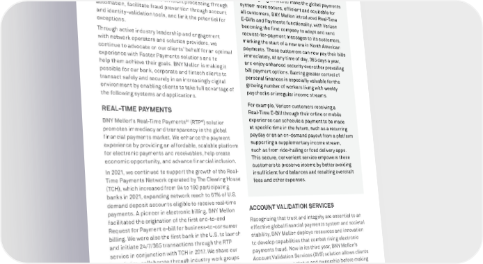 BNY MELLON ENTERPRISE ESG 64 RESPONSIBLE BUSINESS PAPER-TO-DIGITAL JOURNEY In 2021, businesses and consumers expressed greater interest in migrating along the paper-to-digital continuum by transitioning to innovative solutions for sending and receiving funds and associated payment- related details between counterparties. These low- carbon solutions yield more efficient processing through automation, facilitate fraud prevention through account and identity-validation tools, and limit the potential for exceptions. Through active industry leadership and engagement with network operators and solution providers, we continue to advocate on our clients’ behalf for an optimal experience with Faster Payments solutions and to help them achieve their goals. BNY Mellon is making it possible for our bank, corporate and fintech clients to transact safely and securely in an increasingly digital environment by enabling clients to take full advantage of the following systems and applications. REAL-TIME PAYMENTS BNY Mellon’s Real-Time Payments 30 (RTP ® ) solution promotes immediacy and transparency in the global financial payments market. We enhance the payment experience by providing an affordable, scalable platform for electronic payments and receivables, help create economic opportunity, and advance financial inclusion. In 2021, we continued to support the growth of the Real- Time Payments Network operated by The Clearing House (TCH), which increased from 94 to 190 participating banks in 2021, expanding network reach to 61% of U.S. demand deposit accounts eligible to receive real-time payments. A pioneer in electronic billing, BNY Mellon facilitated the origination of the first end-to-end Request for Payment e-bill for business-to-consumer billing. We were also the first bank in the U.S. to launch and initiate 24/7/365 transactions through the RTP service in conjunction with TCH in 2017. We share our knowledge, collaborate through industry work groups and committees, and seek to introduce new use cases, such as Real-Time E-Bills and Payments. 30 R TP and the RTP Network are a registered service mark of The Clearing House Payments Company L.L.C. SPOTLIGHT Real-Time E-Bills and Payments In our ongoing efforts to make the global payments system more secure, efficient and equitable for all customers, BNY Mellon introduced Real-Time E-Bills and Payments functionality, with Verizon becoming the first company to adopt and send request-for-payment messages to its customers, marking the start of a new era in North American payments. These customers can now pay their bills immediately, at any time of day, 365 days a year, and enjoy enhanced security over other prevailing bill payment options. Gaining greater control of personal finances is especially valuable for the growing number of workers living with weekly paychecks or irregular income streams. For example, Verizon customers receiving a Real-Time E-Bill through their online or mobile experience can schedule a payment to be made at specific time in the future, such as a recurring payday or as an on-demand payout from a platform supporting a supplementary income stream, such as from ride-hailing or food delivery apps. This secure, convenient service empowers these customers to preserve income by better avoiding insufficient fund balances and resulting overdraft fees and other expenses. ACCOUNT VALIDATION SERVICES Recognizing that trust and integrity are essential to an effective global financial payments system and societal stability, BNY Mellon deploys resources and innovation to develop capabilities that combat rising electronic payments fraud. Now in its third year, BNY Mellon’s Account Validation Services (AVS) solution allows clients to validate account status and ownership before making a payment. 31 Businesses can confidently verify account status and ownership with bank-consortium data in real time through AVS, which leverages Early Warning Services’ National Shared Database SM . This service is compliant with the new Nacha Web Debit 31 Payment Chek is a trademark of Early Warning Services, LLC.