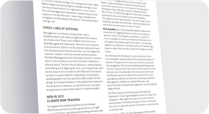 BNY MELLON ENTERPRISE ESG 73 GLOBAL CITIZENSHIP Transition Risk. This refers to risks associated with the transition to a low-carbon economy. These risks will include changes to fiscal and environmental policy, regulation, legislation and technology, as well as investor and consumer sentiment changes that may impact the financial, legal, strategic and reputational risks of our organization. As a result, climate change risk management within BNY Mellon begins by assessing how climate change-driven risk may impact either our organization or our clients. The risk management framework in place requires and supports the identification, reporting, escalation and mitigation of all material risk drivers, including climate change risk. THREE LINES OF DEFENSE Management of climate change-driven risk is implemented in line with our organizational structure and follows the Three Lines of Defense model of our Risk Management Framework. The first line of defense is the business. Each of our businesses takes and owns the risk associated with its activities, and manages the risks and related control processes and procedures. The Risk Management and Compliance functions are the second line of defense, and the third line of defense is Internal Audit. The first line of defense is responsible for identifying and mitigating all risks, including climate risks. As the second line of defense, the Risk and Compliance function is responsible for supporting, reviewing and challenging the first line and has responsibility for the design and implementation of the global risk framework. The third line of defense, our Audit function, provides independent review of any aspect of implementation. NEW IN 2021 CLIMATE RISK TRAINING To support the implementation of the Climate Risk Framework and embed governance oversight responsibilities, we conducted training sessions and provided materials to boards, relevant committees and select teams across all three lines of defense with specific climate risk management obligations. The program outlined the risk management requirements and explained the importance of climate risk within business-as-usual activities. Participants were introduced to risk management tools available for identifying, assessing and managing climate risks. The training encourages participants to lead by example and set the tone to support a culture that institutionalizes appropriate risk management behavior with respect to climate risk. Risk Taxonomy. To ensure risks are consistently identified and categorized across the company, BNY Mellon uses an enterprise-wide risk taxonomy that considers risk across our six enterprise risk categories: Strategic, Credit, Market, Liquidity, Operational and Model risks. This Risk Management Framework enables consistent risk identification across the company. Through this existing framework, climate change-driven financial, physical and transition risks are assessed as risk drivers impacting across all risk types. Risk Appetite. Our Corporate Risk Appetite Statement expresses the aggregate level of risk we are willing to assume, within risk capacity constraints, in order to meet strategic and business objectives. We determine risk appetite by balancing risk and return, considering regulatory, capital and liquidity needs and maintaining a balance sheet that remains resilient throughout market cycles. Our Risk Appetite Statement currently allows for the monitoring and measurement of the potential impact of climate change as a risk driver across all six enterprise risk categories. The Corporate Risk Appetite Statement includes requirements that reinforce the need to ensure climate risk is incorporated into risk assessments and risk-based decision-making. These requirements are cascaded to all lines of business, including Investment Management, Market and Wealth Services, and Securities Services business segments, and all material legal entities. The Board approves the Corporate Risk Appetite Statement, including risk appetite limits for major risk categories. Although limits are not set with specific consideration of climate change (or other risk drivers), the limits in place do provide constraints on any buildup of climate risk. Risk Materiality. The Risk Management Framework employs a risk materiality matrix, which is a corporate- wide, risk-specific benchmark that provides a consistent measurement mechanism for assessing risk likelihood, significance and impact. Risks associated with climate change are assessed using this common benchmark along with all other risk drivers.