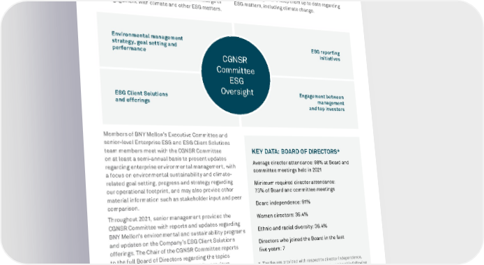 BNY MELLON ENTERPRISE ESG 50 RESPONSIBLE BUSINESS ESG and Climate Governance The CGNSR Committee and the full Board are composed of members who bring a diverse set of skills, backgrounds and experience to BNY Mellon, including in the energy and utilities spaces. These outside interests contribute to the directors’ exposure to, knowledge of and engagement with climate and other ESG matters. Director education courses relating to ESG are included in the regular roster of training opportunities made available to all directors, and the CGNSR Committee expects to continue to focus on ESG-specific director education topics to further enhance the directors’ understanding of and keep them up to date regarding ESG matters, including climate change. Members of BNY Mellon’s Executive Committee and senior-level Enterprise ESG and ESG Client Solutions team members meet with the CGNSR Committee on at least a semi-annual basis to present updates regarding enterprise environmental management, with a focus on environmental sustainability and climate- related goal setting, progress and strategy regarding our operational footprint, and may also provide other material information such as stakeholder input and peer comparison. Throughout 2021, senior management provided the CGNSR Committee with reports and updates regarding BNY Mellon's environmental and sustainability programs and updates on the Company’s ESG Client Solutions offerings. The Chair of the CGNSR Committee reports to the full Board of Directors regarding the topics covered by the CGNSR Committee at its previous meeting. In this way, the Board is kept apprised of material developments regarding our environmental goals and strategies, can monitor such developments, and can incorporate relevant information into its overall decision-making and strategizing processes as appropriate. KEY DATA: BOARD OF DIRECTORS* Average director attendance: 98% at Board and committee meetings held in 2021 Minimum required director attendance: 75% of Board and committee meetings Board independence: 91% Women directors: 36.4% Ethnic and racial diversity: 36.4% Directors who joined the Board in the last five years: 7 * T he figures provided with respect to director independence, diversity and tenure are based on Board membership following the 2022 Annual Meeting of Stockholders. CGNSR Committee ESG Oversight Environmental management strategy, goal setting and performance ESG reporting initiatives ESG Client Solutions and offerings Engagement between management and top investors