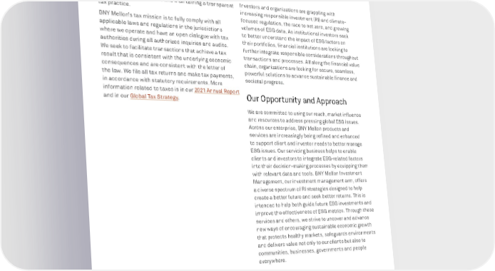 BNY MELLON ENTERPRISE ESG 52 RESPONSIBLE BUSINESS TAX TRANSPARENCY AND INTEGRITY Our firm’s culture of “Doing What’s Right,” as represented in our Code of Conduct, extends to paying taxes. BNY Mellon believes that taxes have an economic and social impact globally. As part of BNY Mellon’s overall ESG strategy, we are committed to acting with integrity in all tax matters and maintaining a transparent tax practice. BNY Mellon’s tax mission is to fully comply with all applicable laws and regulations in the jurisdictions where we operate and have an open dialogue with tax authorities during all authorized inquiries and audits. We seek to facilitate transactions that achieve a tax result that is consistent with the underlying economic consequences and are consistent with the letter of the law. We file all tax returns and make tax payments, in accordance with statutory requirements. More information related to taxes is in our 2021 Annual Report and in our Global Tax Strategy . ESG AND RESPONSIBLE INVESTMENT CLIENT SOLUTIONS Investors and organizations are grappling with increasing responsible investment (RI) and climate- focused regulation, the race to net zero, and growing volumes of ESG data. As institutional investors seek to better understand the impact of ESG factors on their portfolios, financial institutions are looking to further integrate responsible considerations throughout transactions and processes. All along the financial value chain, organizations are looking for secure, seamless, powerful solutions to advance sustainable finance and societal progress. Our Opportunity and Approach We are committed to using our reach, market influence and resources to address pressing global ESG issues. Across our enterprise, BNY Mellon products and services are increasingly being refined and enhanced to support client and investor needs to better manage ESG issues. Our servicing business helps to enable clients and investors to integrate ESG-related factors into their decision-making processes by equipping them with relevant data and tools. BNY Mellon Investment Management, our investment management arm, offers a diverse spectrum of RI strategies designed to help create a better future and seek better returns. This is intended to help both guide future ESG investments and improve the effectiveness of ESG metrics. Through these services and others, we strive to uncover and advance new ways of encouraging sustainable economic growth that protects healthy markets, safeguards environments and delivers value not only to our clients but also to communities, businesses, governments and people everywhere.