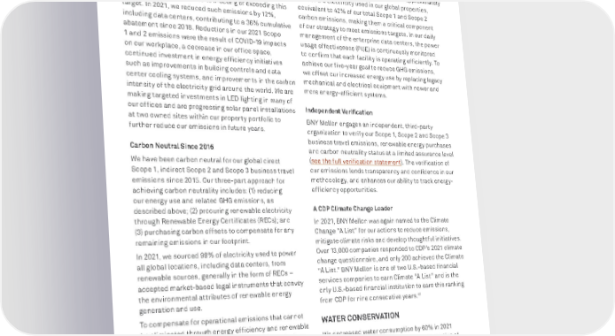 BNY MELLON ENTERPRISE ESG 81 GLOBAL CITIZENSHIP Emissions Reduction In 2019, BNY Mellon set a Scope 1 and Scope 2 GHG emissions reduction target of 20% by 2025, including data centers, relative to a 2018 base year. This Scope 1 and 2 target aligns with the SBTi methodology aimed at limiting increases in global warming to well below 2ºC. We remain committed to meeting or exceeding this target. In 2021, we reduced such emissions by 12%, including data centers, contributing to a 36% cumulative abatement since 2018. Reductions in our 2021 Scope 1 and 2 emissions were the result of COVID-19 impacts on our workplace, a decrease in our office space, continued investment in energy efficiency initiatives such as improvements in building controls and data center cooling systems, and improvements in the carbon intensity of the electricity grid around the world. We are making targeted investments in LED lighting in many of our offices and are progressing solar panel installations at two owned sites within our property portfolio to further reduce our emissions in future years. Carbon Neutral Since 2015 We have been carbon neutral for our global direct Scope 1, indirect Scope 2 and Scope 3 business travel emissions since 2015. Our three-part approach for achieving carbon neutrality includes: (1) reducing our energy use and related GHG emissions, as described above; (2) procuring renewable electricity through Renewable Energy Certificates (RECs); and (3) purchasing carbon offsets to compensate for any remaining emissions in our footprint. In 2021, we sourced 99% of electricity used to power all global locations, including data centers, from renewable sources, generally in the form of RECs – accepted market-based legal instruments that convey the environmental attributes of renewable energy generation and use. To compensate for operational emissions that cannot be eliminated through energy efficiency and renewable electricity, we purchase carbon offsets through clean energy financing and carbon sequestration initiatives. In 2021, 50% of our carbon offsets were directed to the funding of renewable energy projects globally, 25% funded grassland conservation and reforestation projects in the U.S, and 25% funded solar water heating in India. Data Center Emissions As BNY Mellon undergoes a digital transformation, our usage of data has grown, which requires additional data center support and increases our energy use. In 2021, our enterprise data centers accounted for approximately 46% of the electricity used in our global properties, equivalent to 42% of our total Scope 1 and Scope 2 carbon emissions, making them a critical component of our strategy to meet emissions targets. In our daily management of the enterprise data centers, the power usage effectiveness (PUE) is continuously monitored to confirm that each facility is operating efficiently. To achieve our five-year goal to reduce GHG emissions, we offset our increased energy use by replacing legacy mechanical and electrical equipment with newer and more energy-efficient systems. Independent Verification BNY Mellon engages an independent, third-party organization to verify our Scope 1, Scope 2 and Scope 3 business travel emissions, renewable energy purchases and carbon neutrality status at a limited assurance level (see the full verification statement ). The verification of o ur emissions lends transparency and confidence in our methodology, and enhances our ability to track energy- efficiency opportunities. A CDP Climate Change Leader In 2021, BNY Mellon was again named to the Climate Change “A List” for our actions to reduce emissions, mitigate climate risks and develop thoughtful initiatives. Over 13,000 companies responded to CDP’s 2021 climate change questionnaire, and only 200 achieved the Climate “A List.” BNY Mellon is one of two U.S.-based financial services companies to earn Climate “A List” and is the only U.S.-based financial institution to earn this ranking from CDP for nine consecutive years. 41 WATER CONSERVATION We decreased water consumption by 60% in 2021 relative to a 2015 baseline, though a large portion of this reduction was related to lower office occupancy due to the COVID-19 pandemic. We achieved sustained reductions in water consumption through upgrades to high-efficiency fixtures during renovations, updates to irrigation systems, leak detection and monitoring of mechanical equipment. 41 The A List 2021 , CDP