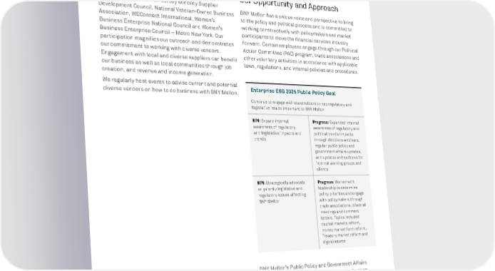 BNY MELLON ENTERPRISE ESG 85 GLOBAL CITIZENSHIP OUTREACH AND EXTERNAL ADVOCACY RELATIONSHIPS We are members of many advocacy organizations, including the Financial Services Roundtable for Supplier Diversity, National Gay & Lesbian Chamber of Commerce, National Minority Supplier Development Council, New York & New Jersey Minority Supplier Development Council, National Veteran-Owned Business Association, WEConnect International, Women’s Business Enterprise National Council and Women’s Business Enterprise Council – Metro New York. Our participation magnifies our outreach and demonstrates our commitment to working with diverse vendors. Engagement with local and diverse suppliers can benefit our business as well as local communities through job creation, and revenue and income generation. We regularly host events to advise current and potential diverse vendors on how to do business with BNY Mellon. ADVOCACY AND POLITICAL ENGAGEMENT Our Opportunity and Approach BNY Mellon has a unique voice and perspective to bring to the policy and political process and is committed to working constructively with policymakers and market participants to move the financial services industry forward. Certain employees engage through our Political Action Committee (PAC) program, trade associations and other voluntary activities in accordance with applicable laws, regulations, and internal policies and procedures. Enterprise ESG 2025 Public Policy Goal Continue to engage with stakeholders on key regulatory and legislative issues important to BNY Mellon KPI: Expand internal awareness of regulatory and legislative impacts and trends Progress: Expanded internal awareness of regulatory and political trends/impacts through elections webinars, regular public policy and government affairs updates, and updates and outlooks for internal working groups and clients KPI: Strategically advocate on priority legislative and regulatory issues affecting BNY Mellon Progress: Worked with leadership to determine policy priorities and engage with policymakers through trade associations, bilateral meetings and comment letters. Topics included capital markets reform, money market fund reform, Treasury market reform and digital assets BNY Mellon’s Public Policy and Government Affairs team is responsible for all political activity by or on behalf of BNY Mellon, including administration of the PACs. The Public Policy and Government Affairs team reports to the General Counsel and provides updates at least annually to the CGNSR Committee of the Board of Directors. These activities are conducted in accordance
