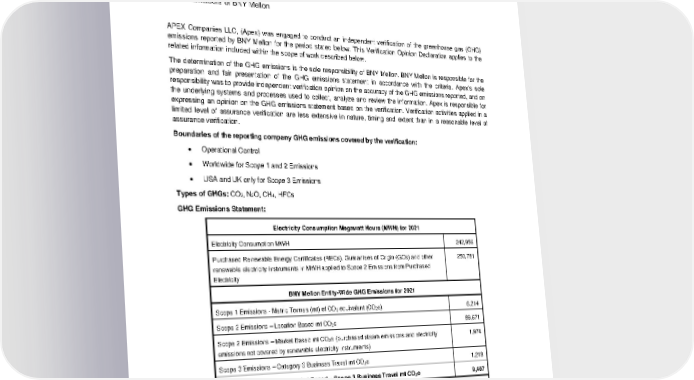 VERIFICATION OPINION D ECLARATION GREENHOUSE GAS EMISSIONS To: Stakeholders of BNY Mellon APEX Companies LLC, (Apex ) was engaged to conduct an independent verification of the greenhouse gas (GHG) emissions reported by BNY Mellon for the per iod s tated b e l ow. Th is Verifi c at i o n Opinio n Declaration applies t o the related information included within the scope of work described below. The determination of the GHG emissions is the sole responsibility of BNY Mellon . BNY Mellon is respon sible for the prep aration and f air pr e se n t at i o n of t he GHG emissio ns statement in accord ance with the criteria . Apex’ s sole responsibility was to provide independent verification opi ni on on the accuracy of the GHG e missions reported, and on the underlying systems and processes use d to coll ect, an a ly ze and rev iew the i n fo r m at ion. Apex is responsible for expressing an opinion on the GHG emissions statement based on the verification. Verification activi ties applied in a limited level of assurance verification are less extensive in natu re, tim in g and e xt ent than i n a re as on able leve l o f as surance verification. Boundaries of the reporting company GHG emissions covered by the verification: • Operational Control • Worldwide for Scope 1 and 2 Emissions • USA and UK only for Scope 3 Emissions T y p es of GHGs : CO 2 , N 2 O, CH 4 , HFCs GHG Emiss ions St at e men t : Electricity Consumption Megawatt Hours (MWH) for 20 2 1 Electricity Consumption MWH 242,956 Purchased Renewable Energy Certificates (RECs) , Guarantees of Origin (GOs) and other renewable electricity instruments i n MWH applied to Scope 2 Emissions from Purchased Electricity 250,781 BNY Mellon Entity - Wide GHG Emissions for 20 2 1 Scope 1 E missions - Metric Tonnes (mt) of CO 2 equivalent (CO 2 e ) 6,214 Scope 2 Emissions – Location Based mt CO 2 e 89,671 S c ope 2 Emissions – Market Based mt CO 2 e (purchased steam emissions and electricity emissions not covered by renewable electricity instrumen ts ) 1,974 Scope 3 Emissions – Category 6 Business Travel mt CO 2 e 1,219 Total S cope 1 + Scope 2 Market Based + Scop e 3 Business Trave l mt CO 2 e 9,407 GHG Emission Offsets and Net Emissions for 20 2 1 Purchased GHG Emission Offsets mt CO 2 e 10,000 Net Emissions CO 2 e (Scope 1 + Scope 2 Market Based + Scope 3) - Purchased GHG Emission O ffsets 0