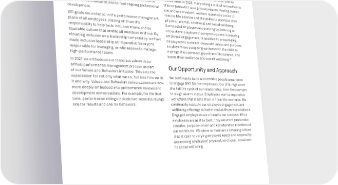 BNY MELLON ENTERPRISE ESG 30 CULTURE AND PURPOSE Performance Management Our performance management process plays a critical role in building a high-performance culture and facilitates the alignment of individual contributions with enterprise strategy. Manager and team member conversations create a rich feedback loop to reinforce performance standards and to fuel ongoing professional development. DEI goals are included in the performance management plans of all employees, placing on them the responsibility to help build inclusive teams and an equitable culture that enable all members to thrive. By elevating inclusion as a leadership competency, we have made inclusive leadership an imperative for anyone responsible for managing, or who aspires to manage, high-performance teams. In 2021 we embedded our corporate values in our annual performance management process as part of our Values and Behaviors initiative. This sets the expectation for not only what we do, but also how we do it and why. Values and Behaviors conversations are now more deeply embedded into performance reviews and development conversations. For example, for the first time, performance ratings include two separate ratings, one for results and one for behaviors. EMPLOYEE ENGAGEMENT, RETENTION AND WELLBEING Employees in job markets globally left their jobs at record rates in 2021, many citing a lack of connection to their organization as a primary reason. Feeling burned out and undervalued, workers reported a desire to restore life balance and the ability to prioritize their physical, mental, emotional and social wellbeing. Successful employers are evolving by listening to understand employees’ perspectives and increasing employee engagement. In addition to encouraging employees to embrace corporate values and purpose, employers are equipping workers with the skills to manage their personal growth and life balance, and boost their resilience and overall wellbeing. 13 Our Opportunity and Approach We continue to build a distinctive people experience to engage BNY Mellon employees. Our offerings cover the full life cycle of our relationship, from first contact through alumni status. Employees want a supportive workplace that meets them in their life moments. We continually evaluate our employee engagement and wellbeing offerings to better realize those expectations. Engaged employees are critical to our success: When employees are at their best, they are more productive, creative, purpose-driven and collaborative members of our workforce. We strive to maintain a listening culture that is open to varying employee needs and respond by addressing employees’ physical, emotional, social and financial wellbeing. 13 The Great Attrition: The power of adaptability , McKinsey Organization Blog, Nov. 22, 2021
