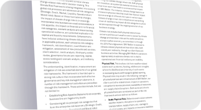 BNY MELLON ENTERPRISE ESG 72 GLOBAL CITIZENSHIP NEW IN 2021: EXPANDED RISK MANAGEMENT FRAMEWORK With the goal of considering climate change risks in a structured and robust manner, BNY Mellon has expanded our Risk Management Framework to provide an objective basis to identify and consider climate change-related risks within decision-making. This Climate Risk Framework is being integrated into existing global risk processes and addresses all risk categories (Strategic, Credit, Market, Liquidity, Operational and Model risks). Based on these foundational changes, the impact of climate change risks is increasingly incorporated into business-as-usual considerations in risk appetite, the impact on financial and nonfinancial risk categories, scenario analysis and stress testing, operational resilience, and potential implications for capital and liquidity requirements. Enhancements have included embedding climate risk assessments in applicable policies, each enterprise risk category framework, risk identification, quantification and mitigation, assessment of new products and services, client selection, credit analysis, third-party vendor review, governance forums and reporting, capital, stress testing and scenario analysis, and resiliency considerations. The understanding, identification, measurement and mitigation of risk are essential elements of our global risk frameworks. The framework is founded upon a strong risk culture that incorporates both effective governance and key risk management elements. A number of risk management activities are prescribed through this framework. These activities include, but are not limited to: • Establishing Risk Appetite Statements at corporate, business line and legal entity levels • Considering all six principal risk categories that form the enterprise risk taxonomy (Strategic, Credit, Market, Liquidity, Operational and Model risks) • Employing enterprise- and business line-level risk assessments • Identifying and measuring risk • Utilizing stress testing and scenario analysis PHYSICAL AND TRANSITION RISKS As an extension of our driving philosophy to Consider Everything SM , we are committed to understanding and addressing potential internal and external sources of risk. Within our approach to holistic risk management, we recognize climate change-driven risk, both physical and transition, as a potential material risk driver. A risk driver is an event that leads to a consequential impact on BNY Mellon. For instance, climate change leads to an increase in physical risks that could then have an impact across a range of different risk types in various ways. Climate change-driven risk is therefore an overarching driver of risk that may impact all risk categories to which we are exposed through the ongoing execution of our business strategy. Climate risk includes both physical risks of more extreme and frequent weather events caused by climate change and transition risks as the world converts to a lower-carbon economy, as committed to through the 2015 Paris Agreement. BNY Mellon is exposed to climate-related physical and transition risks, both directly and indirectly, through our client base and business activities. Managing BNY Mellon’s operations appropriately to address climate risk is vital to operational and financial resiliency and stability. Physical Risk. This involves risk from weather-related events such as storms, flooding, wildfires and droughts where the likelihood and intensity of such events is increasing due to anthropogenic global warming. Physical risks may result in the following: damage to physical premises and infrastructure of BNY Mellon, our clients and other stakeholders; impact on operations; disruption to service providers; availability of resources; and supply chain disruptions. Both acute and chronic physical effects are considered as part of the risk framework and are defined as follows: • Acute Physical Risk. Refers to event-driven extreme weather impacts; disruptions to operations, transportation, supply chains, etc.; damage to physical assets; and impacts on insurance liabilities • Chronic Physical Risk. Encompasses longer- term shifts in climate patterns, e.g., rising mean temperature; water stress; degradation or limitations on resource availability, e.g., labor, natural resources, etc.