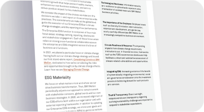 BNY MELLON ENTERPRISE ESG 11 APPROACH ENTERPRISE ESG IMPLEMENTATION The Enterprise ESG function is composed of four main focus areas: strategy setting, reporting, disclosures and stakeholder engagement. Each of these focus areas relies on strong cross-functional collaboration across the enterprise and ESG integration across the lines of business and functions. In 2021, we placed a particular focus on climate change, having built out our climate change strategy and issued our first stand-alone report, Considering Climate at BNY Mellon , dedicated to how we’re considering the risks and opportunities brought on by climate change effects. Learn how we are Managing Climate Change . ESG Materiality We focus on what matters most and where we can drive business transformation. Thus, BNY Mellon periodically adjusts our approach to remain current with stakeholder concerns, global trends and our own business strategies. In 2020, we increased alignment of our ESG efforts both within our organization and with external reporting frameworks. In addition to updating our Enterprise ESG strategy, we introduced goals and key performance indicators (KPIs) to guide our actions from 2020 through 2025. Our Enterprise ESG strategy and goals are based on research and stakeholder input gathered through an ESG materiality assessment process conducted in 2019 that helped us determine the most relevant ESG issues for BNY Mellon. 8 8 2020 Enterprise ESG Report , page 10 ESG MATERIALITY ASSESSMENT KEY THEMES Technological Resilience: Information security and resilience to cyberattacks represent a key intersection of societal needs and BNY Mellon business priorities. The Importance of the Employee: Employee issues such as diversity & inclusion, talent attraction, retention and development, and gender pay equity can help differentiate BNY Mellon in an increasingly competitive business environment. Climate Readiness & Response: The impending impacts from climate change require every institution to act. In financial services, frameworks such as the TCFD recommended disclosures help facilitate a robust and substantive assessment of climate-related vulnerabilities and opportunities. Integrating ESG: Increasing evidence of the benefit of systematically integrating environmental, social and governance considerations into the investment process is bolstering demand for such products and services. Tr u s t & Tr a n s p a r e n c y : Board oversight, responsiveness and transparency regarding evolving sustainability challenges are important to respond to stakeholder expectations. We consider the impact of the choices we make and the decisions we take — and report on those enterprise-wide practices. The commitments we make at the global level guide the execution of our Enterprise ESG and climate change strategies, and the reporting of our performance. Enterprise ESG impacts the culture at BNY Mellon, informs our responsible business practices, and inspires our global citizenship. We contribute to sustainable economic growth that helps protect healthy markets, enhances our own business resiliency, and aims to deliver positive impact for key stakeholders.