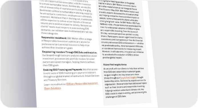 BNY MELLON ENTERPRISE ESG 10 APPROACH We are meeting client and investor demand to elevate the scope and focus of our collaboration with clients, and our focus on Responsible Investment. We expect Responsible Investment to expand significantly as asset managers increasingly understand that it is no longer possible to successfully manage portfolios without a comprehensive analysis of the risks and opportunities associated with the transition to a more sustainable future. Additionally, we see the role of stewardship of capital as profoundly changing. Businesses without a sustainable model may cease to be attractive to customers, employees and ultimately investors. We believe that in the long run, investments will be expected to deliver a twin benefit of financial returns and a positive impact to society. Because our clients’ needs must respond to ever-evolving ESG demands, our solutions are multifaceted and fall into three categories: Responsible Investment: BNY Mellon offers a range of Responsible Investment options and advice for professional and personal investors to help them achieve their investment goals. Empowering Investors Through ESG Data and Analytics: Our breakthrough tools and analytics capabilities power investment processes and portfolio reviews for asset owners and asset managers, helping them to achieve their ESG goals. Enabling ESG Financing and Payments: We offer an end- to-end suite of ESG financing and payments solutions through our global market infrastructure, Issuer Services and Treasury Services. Learn more about our ESG and Responsible Investment Client Solutions . SPOTLIGHT Innovations for Future Value Leveraging our leading position in the global capital markets, BNY Mellon convened clients and other stakeholders at our inaugural Future First Forum in May 2021. BNY Mellon leaders and industry experts discussed the innovations that are helping companies have a positive impact on people, communities and the planet while also driving long-term value. As BNY Mellon CEO Todd Gibbons noted, the pandemic has accelerated the need for widespread adoption of ESG principles and responsible investing. Over the course of the day, various perspectives pointed to a key theme: Participants saw an urgent need for clarity, consistency and transparency in how the financial industry addresses ESG considerations — whether via predictable policy, more transparent ESG data, or consistent frameworks for measuring impact. However, it will take time, innovation and initiative to accelerate the evolution of ESG to deliver positive global impact. Future First Insights Series As we work with our clients to help them achieve their ESG and responsible investment goals, we gain insights into key issues and share those through our Future First Insights thought leadership series. Authored by experts across the organization, these articles have addressed topics such as fixed income and responsible investing, helping investors understand climate risk, key ESG trends in retail investing, and addressing the challenges of ESG data.