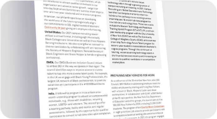 BNY MELLON ENTERPRISE ESG 29 CULTURE AND PURPOSE EMERGING TALENT PROGRAMS Attracting outstanding individuals from all backgrounds to our organization is vital to achieving our corporate value “passion for excellence” and remaining a global leader in financial services. We invest in our coordinated suite of programs for individuals at key transition points in their career progression. These opportunities, which are structured to attract qualified individuals to our organization and advance career growth, range from one-day Sophomore Summits and summer internships to one- and two-year rotational and immersion programs. In tandem, our philanthropic focus on developing the workforce of the future synergistically aligns our commitments to DEI, digital transformation and Community Impact giving and employee volunteering. United States. Our 2021 campus recruiting season utilized a virtual format, including eight Historically Black Colleges and Universities as well as three Hispanic Serving Institutions. We also strengthened outreach to diverse candidates by collaborating with and sponsoring the Society of Hispanic Engineers, National Society of Black Engineers and Grace Hopper (a female engineering conference). EMEA. Our EMEA Business Inclusion Council strives to embed DEI in the way we operate in that region. The council identifies ways to improve access to diverse talent to tap into more diverse talent pools. For example, in the UK we engage with Black Young Professionals, the largest UK network of Black professionals, to promote vacancies and participate in the #10000BlackInterns program. India. A fellowship program in India utilizes a six- month internship program to attract underrepresented individuals, e.g., those with disabilities, returning women, LGBTQ+ and veterans. The internships offer a learning pathway, buddy and mentor, and regular assessments, followed by the opportunity for qualified candidates to convert to full-time roles upon completion. SPOTLIGHT Cultivating Technology Talent BNY Mellon prepares and recruits future technology talent through a growing system of campus recruiting and training. In 2021, Campus Recruiting and Global Operations and Technology launched two bespoke mentor-to-intern-to- full-time-hire pathways to our existing summer internship and 18-month full-time program for new full-time technology hires. These new routes include the Student Technology and Readiness Training Upskill Program (S.T.A.R.T.U.P.), a school- year mentorship program with the City University of New York (CUNY) as well as The Community College of Allegheny County (CCAC), and a summer internship Technology Future Talent program for second-year students in associate and bachelor’s degree programs. Through this continuum of training, we are advancing technology talent in the financial services industry and increasing our access to qualified candidates in a competitive marketplace. PREPARING NEW YORKERS FOR WORK As a cofounder of the 30-member New York Jobs CEO Council, BNY Mellon is addressing employer needs for skilled employees by training and hiring New Yorkers, with a focus on Black, Hispanic/Latinx and Asian communities. In collaboration with CUNY, a BNY Mellon philanthropic partner, the New York City Department of Education and other groups, the council aims to hire 100,000 New Yorkers by 2030, including 25,000 CUNY students. The program offers EverUp Micro-Credentials in eight prioritized job areas to provide participants with a competitive boost at landing jobs and internships at Jobs Council companies. In 2021, the program engaged more than 1,600 students in information sessions, and 820 CUNY students completed EverUp Micro-Credential Skills Training. In addition, five redesigned degree programs were codeveloped by CUNY faculty and over 30 company subject matter experts.