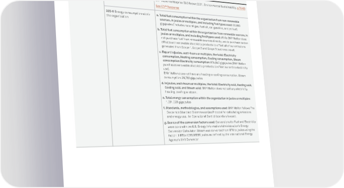 BNY MELLON ENTERPRISE ESG 99 APPENDIX CATEGORY: ENVIRONMENTAL Aspect: Energy Standard Disclosure Our Response GRI 302: Energy 2016 Management approach disclosure BNY Mellon Enterprise ESG Report 2021, Environmental Sustainability, p.79-83 See CDP Response 302-1 Energy consumption within the organization a. Total fuel consumption within the organization from non-renewable sources, in joules or multiples, and including fuel types used: 99,669 gigajoules (includes natural gas, fuel oil, car gasoline, and jet fuel) b. Total fuel consumption within the organization from renewable sources, in joules or multiples, and including fuel types used: While BNY Mellon does not purchase fuel from renewable sources directly; we do purchase carbon offsets and renewable electricity products to offset all of our emissions generated from Scope 1, Scope 2 and Scope 3 business travel. c. Report in joules, watt-hours or multiples, the total: Electricity consumption, Heating consumption, Cooling consumption, Steam consumption Electricity consumption: 874,640 gigajoules (BNY Mellon purchases renewable electricity products to offset our entire electricity use). BNY Mellon does not have any heating or cooling consumption. Steam consumption: 26,782 gigajoules d. In joules, watt-hours or multiples, the total: Electricity sold, Heating sold, Cooling sold, and Steam sold: BNY Mellon does not sell any electricity, heating, cooling or steam. e. Total energy consumption within the organization in joules or multiples: 1,001,090 gigajoules f. Standards, methodologies, and assumptions used: BNY Mellon follows The Corporate Standard Greenhouse Gas Protocol for calculating emissions and energy use. An Operational Control boundary is used. g. Source of the conversion factors used: Conversions for Fuel and Electricity were done with the U.S. Energy Information Administration’s Energy Conversion Calculator. Steam was converted from BTU to joules using the factor: 1 BTU=1055.05585 joules as defined by the International Energy Agency’s Unit Converter