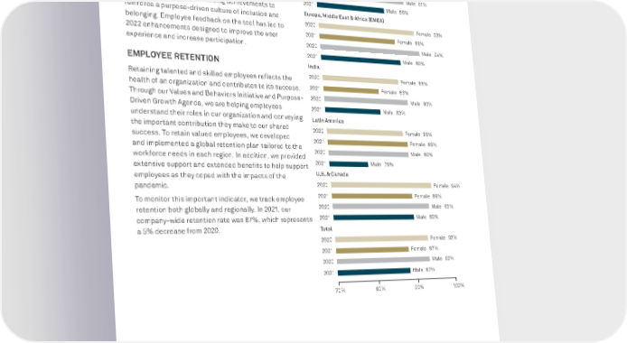 BNY MELLON ENTERPRISE ESG 32 CULTURE AND PURPOSE CELEBRATING ACHIEVEMENTS We have also built our Values and Behaviors into our company-wide recognition program, so that employee nominations are now aligned to the defined values and behaviors that we want to reinforce. This program acknowledges performance, celebrates service milestones and tracks wellbeing achievements to reinforce a purpose-driven culture of inclusion and belonging. Employee feedback on the tool has led to 2022 enhancements designed to improve the user experience and increase participation. EMPLOYEE RETENTION Retaining talented and skilled employees reflects the health of an organization and contributes to its success. Through our Values and Behaviors Initiative and Purpose- Driven Growth Agenda, we are helping employees understand their roles in our organization and conveying the important contribution they make to our shared success. To retain valued employees, we developed and implemented a global retention plan tailored to the workforce needs in each region. In addition, we provided extensive support and extended benefits to help support employees as they coped with the impacts of the pandemic. To monitor this important indicator, we track employee retention both globally and regionally. In 2021, our company-wide retention rate was 87%, which represents a 5% decrease from 2020. Employee Retention by Region Asia Pacific 2020 Female 91% 2021 Female 86% 2020 Male 91% 2021 Male 86% Europe, Middle East & Africa (EMEA) 2020 Female 93% 2021 Female 88% 2020 Male 94% 2021 Male 89% India 2020 Female 88% 2021 Female 83% 2020 Male 90% 2021 Male 83% Latin America 2020 Female 88% 2021 Female 89% 2020 Male 89% 2021 Male 79% U.S. & Canada 2020 Female 94% 2021 Female 89% 2020 Male 93% 2021 Male 89% To t a l 2020 Female 92% 2021 Female 87% 2020 Male 92% 2021 Male 87% 70% 8 0% 9 0% 1 00%